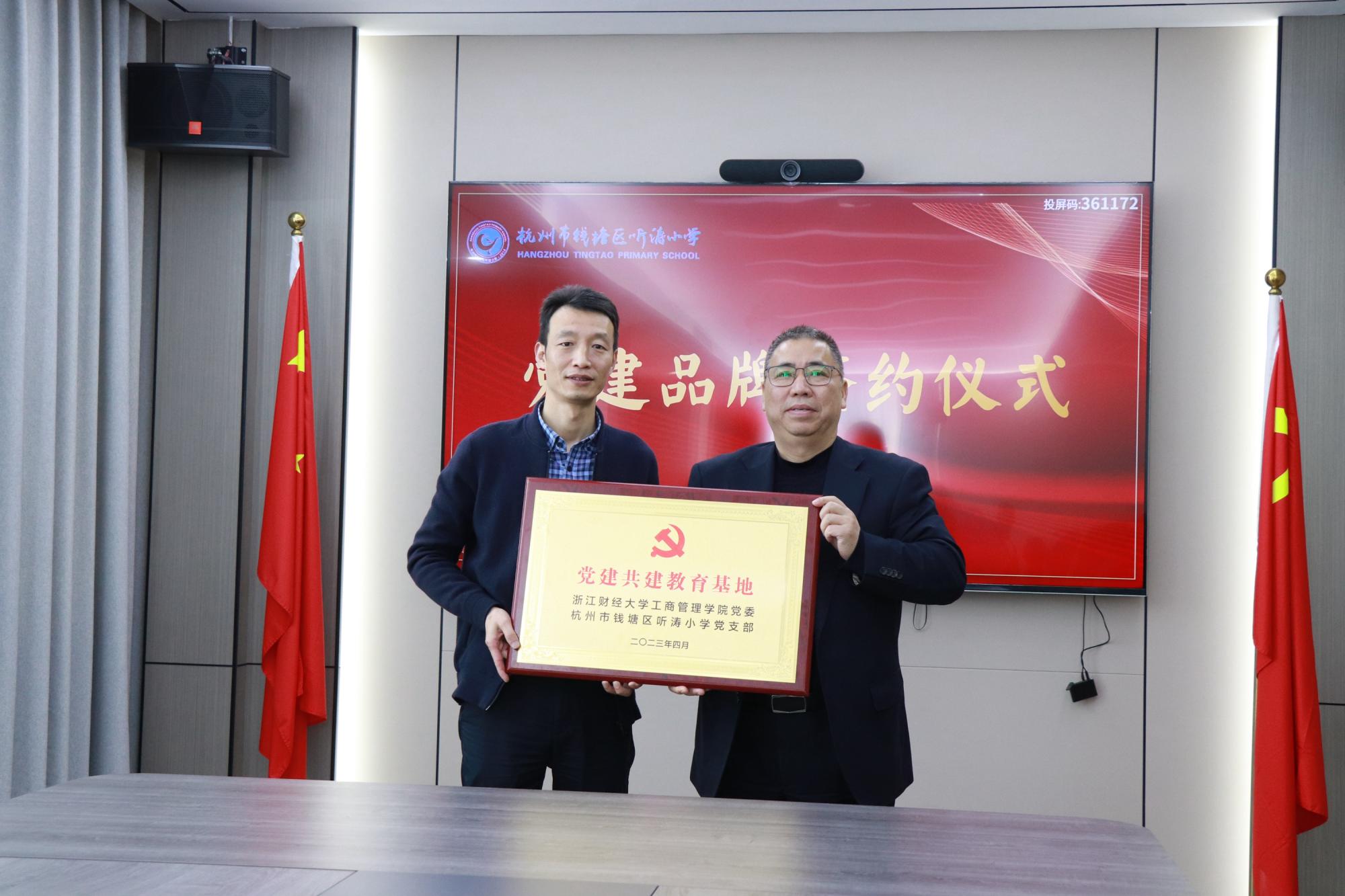 4月7日,工商5278论坛 党委与杭州市钱塘区听涛小学党支部举行党建共建签约仪式。工商5278论坛 党委书记黄卫华、院长王建明,5278论坛 附属听涛小学校长王卫华、党支部副书记、副校长王长军等出席签约仪式。