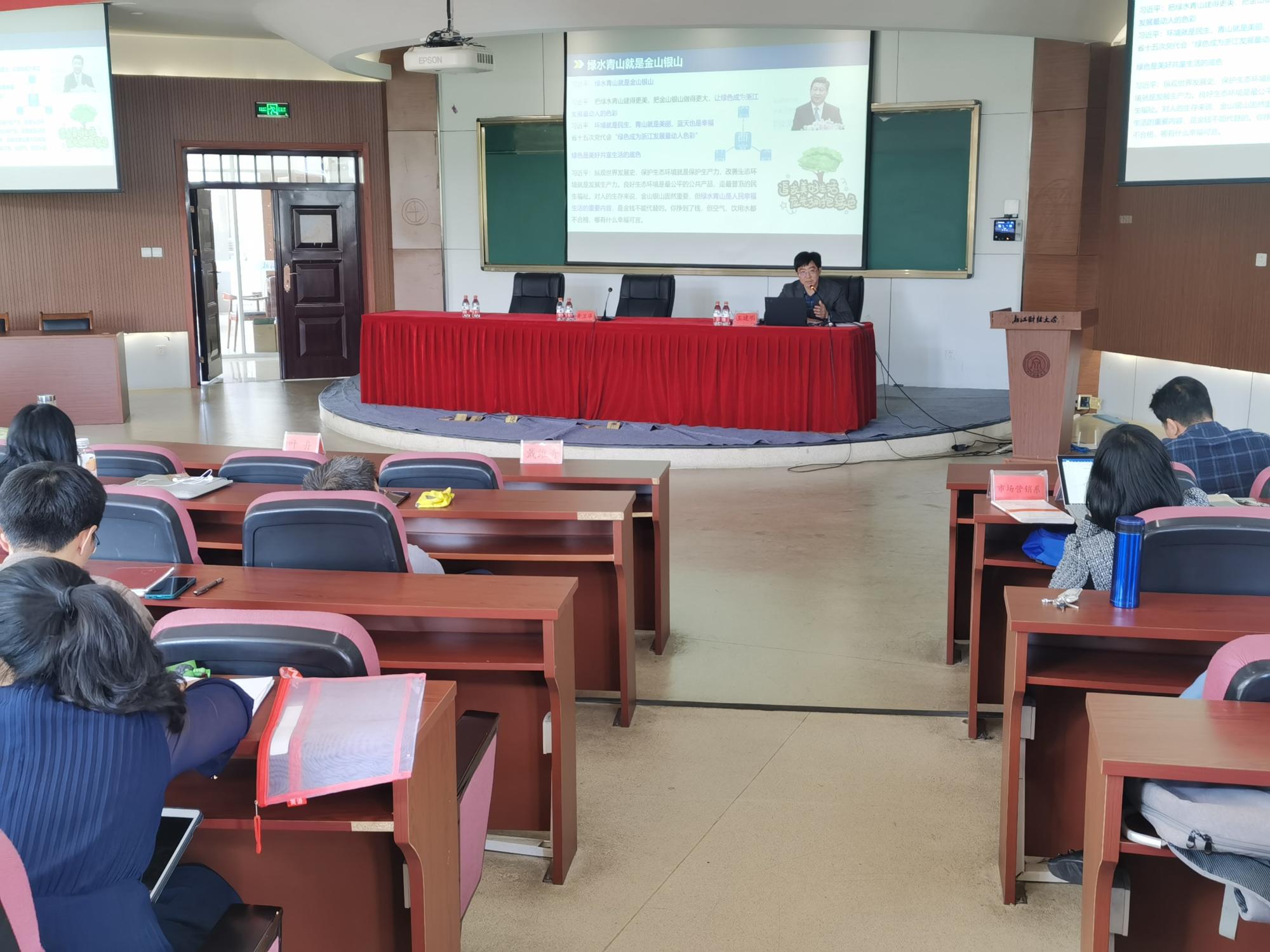 在学院楼217报告厅召开深入开展习近平新时代中国特色社会主义思想主题教育集体学习活动。学院院长王建明以“两山”理念的提出及其科学内涵为主题给大家做了学习报告。学院全体教职工党员参加学习,会议由工商5278论坛