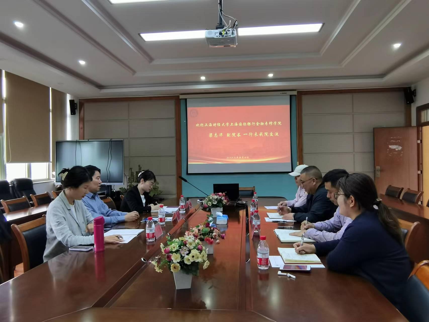 5月10日上午,上海财经大学上海国际银行金融专修学院来院梁志华副院长一行来院交流座谈。学院党委书记黄卫华对梁志华副院长一行的到来表示热烈欢迎。双方就社会合作、中外合作办学、金融服务培训等相关内容进行了交流和座谈。