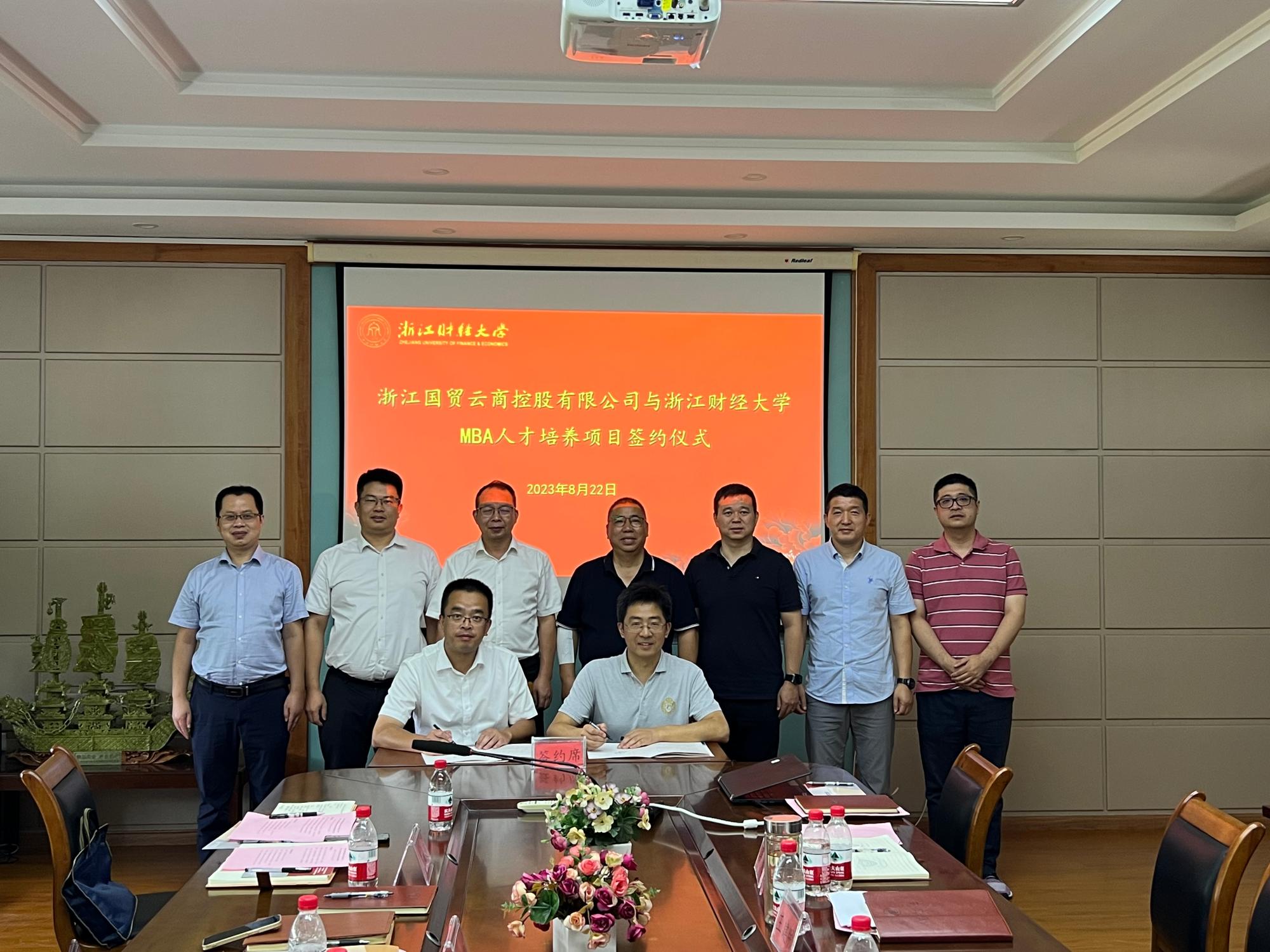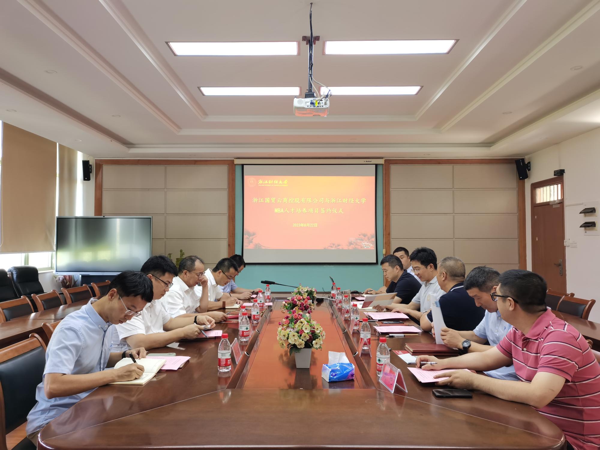 MBA人才培养项目合作签约仪式在5号学院楼410会议室举行。浙江国贸云商控股有限公司党委书记、董事长濮志江,党委副书记、纪委书记鲁霜慧,省国贸集团党委组织部(人力资源部)副部长戴纯平, 国贸云商人力资源部经理丁成山,工商5278论坛