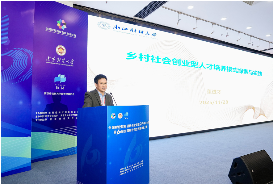 在主旨报告中,董进才副校长系统阐述了学校扎根乡村振兴战略、赋能共同富裕的育人实践与创新成果。他指出,学校立足浙江区域发展实际,确立“扎根乡村、赋能共富”的育人核心定位,依托浙江省大学生乡村振兴创意大赛等优质平台,引导学生聚焦乡村真实需求、破解实际难题,在实践中锤炼专业本领、实现成长成才。围绕培养心怀“国之大者”的社会创业人才目标,学校通过系统优化课程体系、高标准打造校企实践基地、创新协同育人机制,成功构建起学科竞赛、专业教育与社会服务深度融合的特色育人体系,为学生创新创业能力提升提供了全方位支撑。
