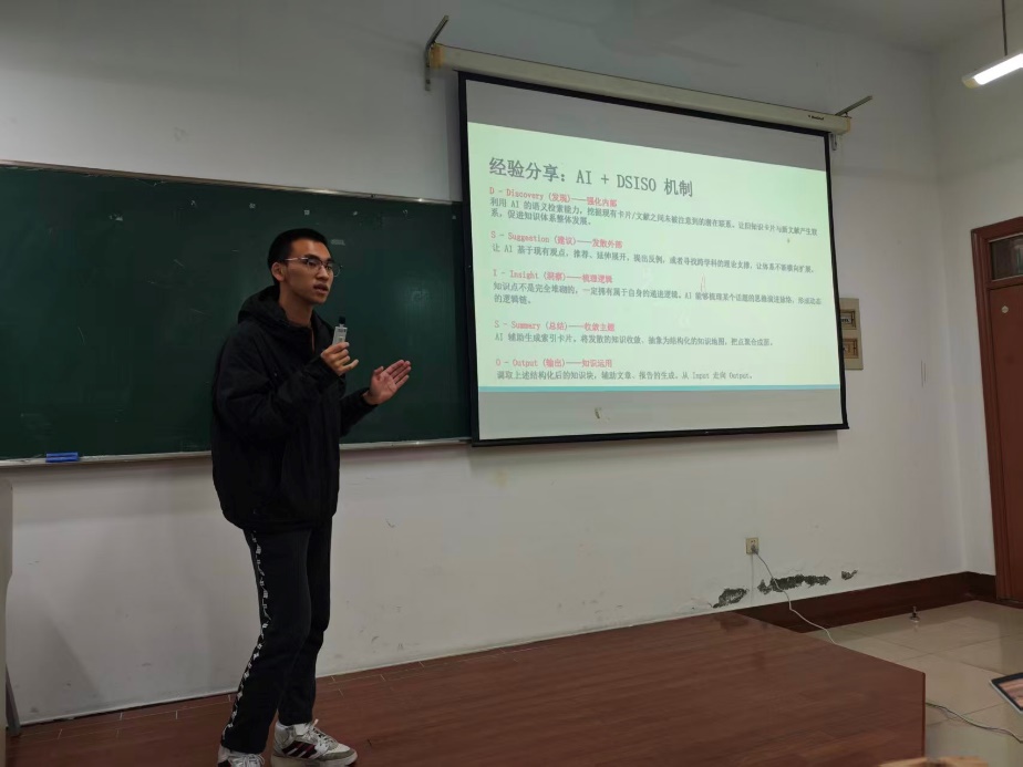 在随后的报告中,周欣雷同学以“AI不是替代人完成任务的工具,而是与人共同成长的外置大脑”为切入点,系统阐述了AI驱动科研与学习工作流的整体框架。本次讲座并未聚焦于单一工具的操作技巧,而是围绕“构建工作流”这一核心目标,深入分析了学生在知识管理、文献阅读和程序开发中普遍面临的认知断层、能力断层与应用断层问题。围绕知识与文献管理场景,周欣雷同学结合DSISO模型,展示了如何借助AI将分散、零碎的信息逐步转化为结构化、可生长的知识体系;在程序开发与编码场景中,他提出“意图优先”的方法论,强调人类负责定义目标、约束与成功标准,AI则承担执行与调试任务,从而帮助非计算机专业学生克服编程畏难情绪,实现从“不会写代码”到“会指挥代码”的能力转变。相关案例演示直观呈现了AI在科研与学习中的协作潜力,引发了在场师生的浓厚兴趣。