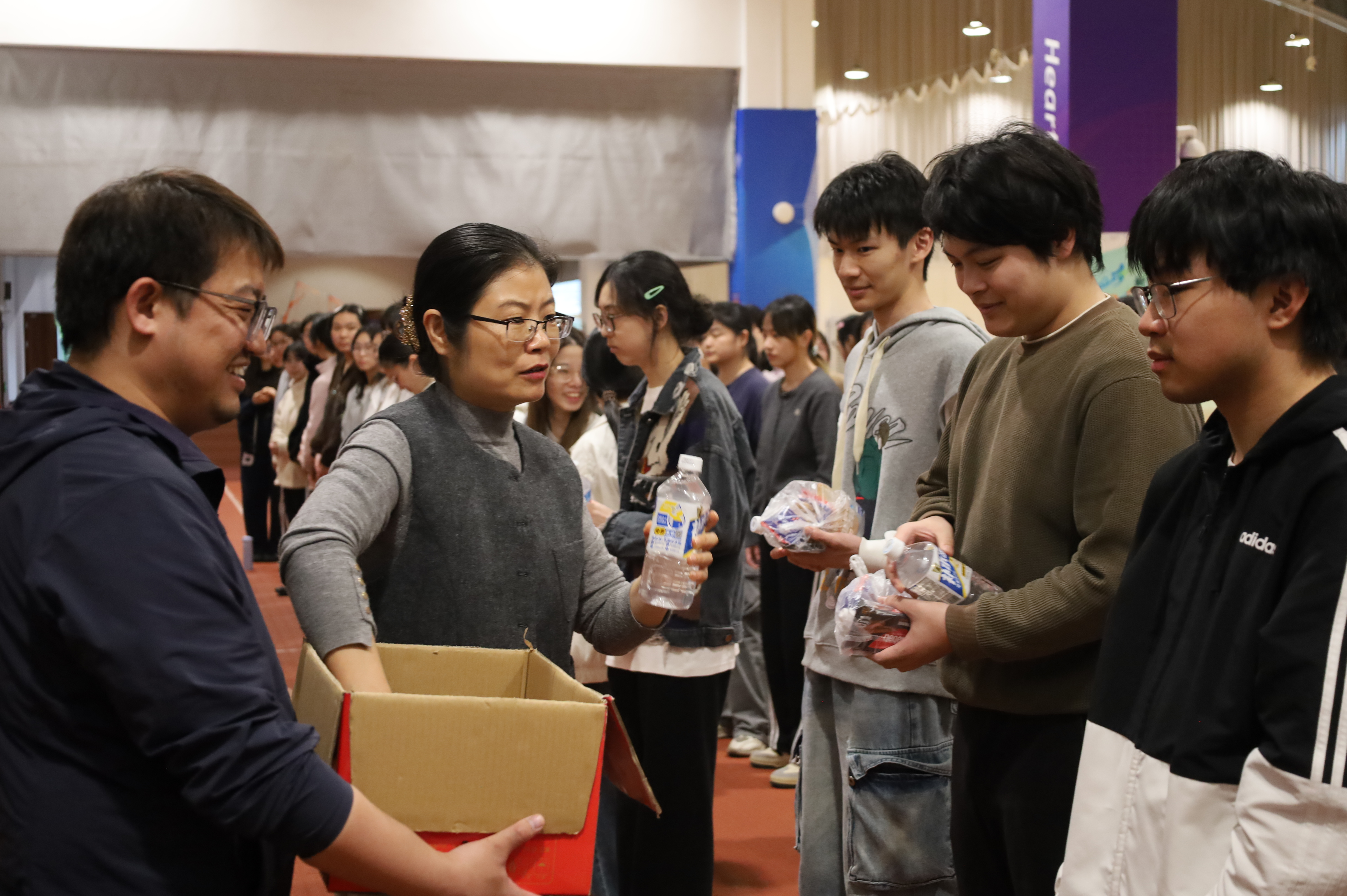 随后,学院领导将面包、运动饮料等慰问物资一一送到同学们手中,同学们纷纷表示倍感温暖,一定不负期望,认真训练、安全完赛,努力为学校、学院争光。