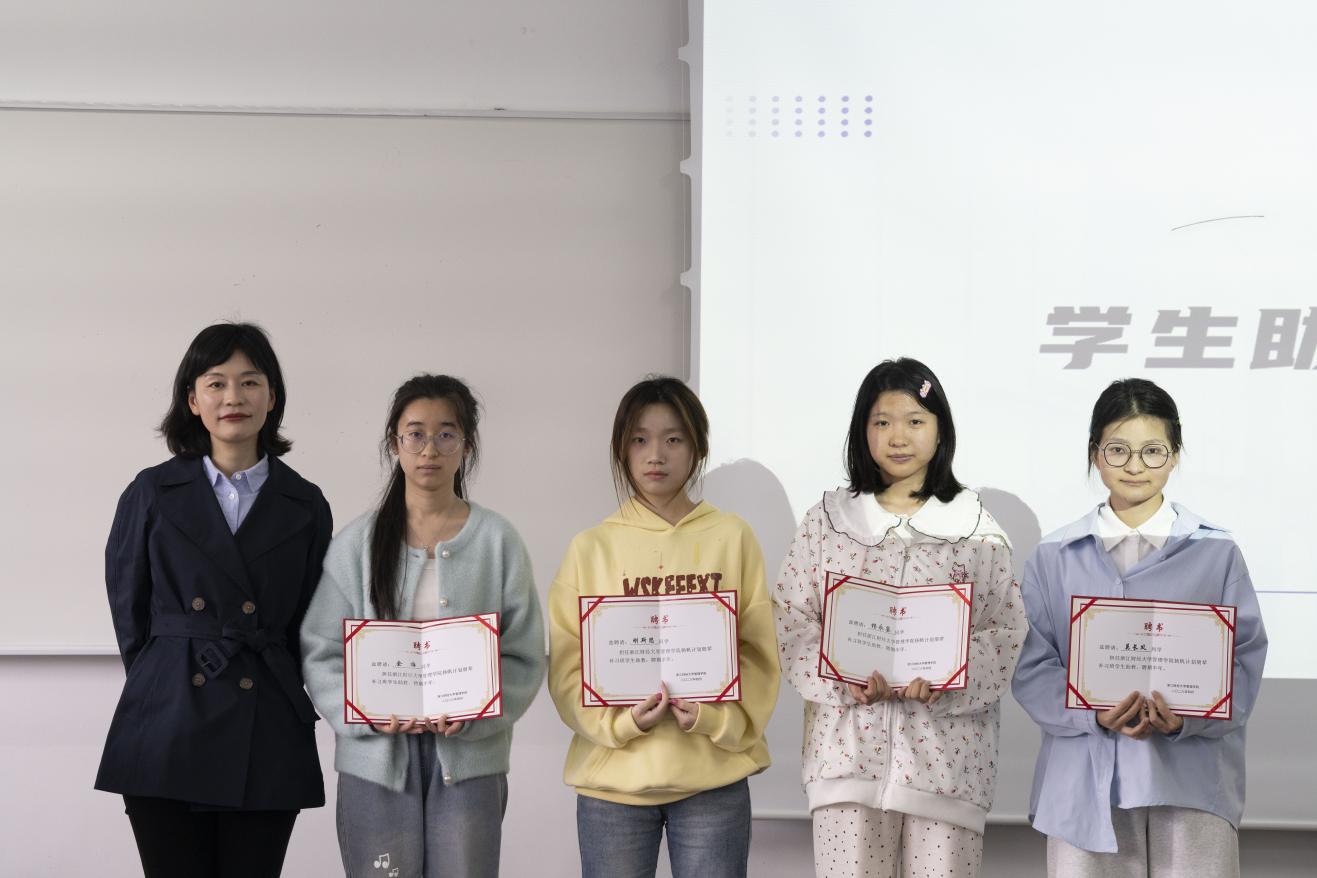 仪式现场举行学生助教聘任仪式,陈小芳为受聘学生助教颁发聘书,并与全体助教合影留念。
