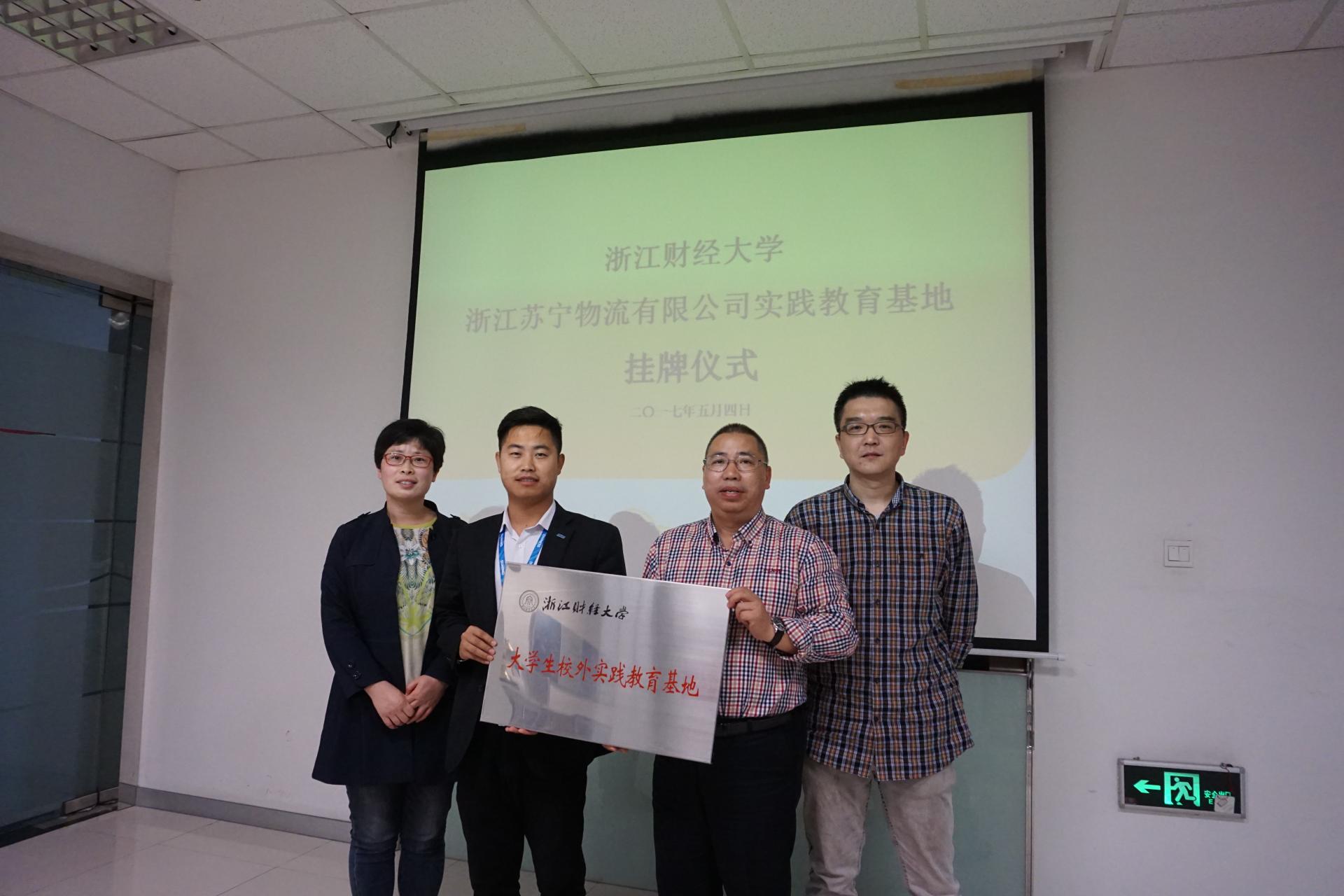 与浙江省苏宁物流有限公司举行共建校级实践教育基地挂牌,学院党委书记黄卫华、物流管理系主任田家欣、李晓超老师与浙江省苏宁物流有限公司总经理唐成红等企业代表出席了本次挂牌仪式。