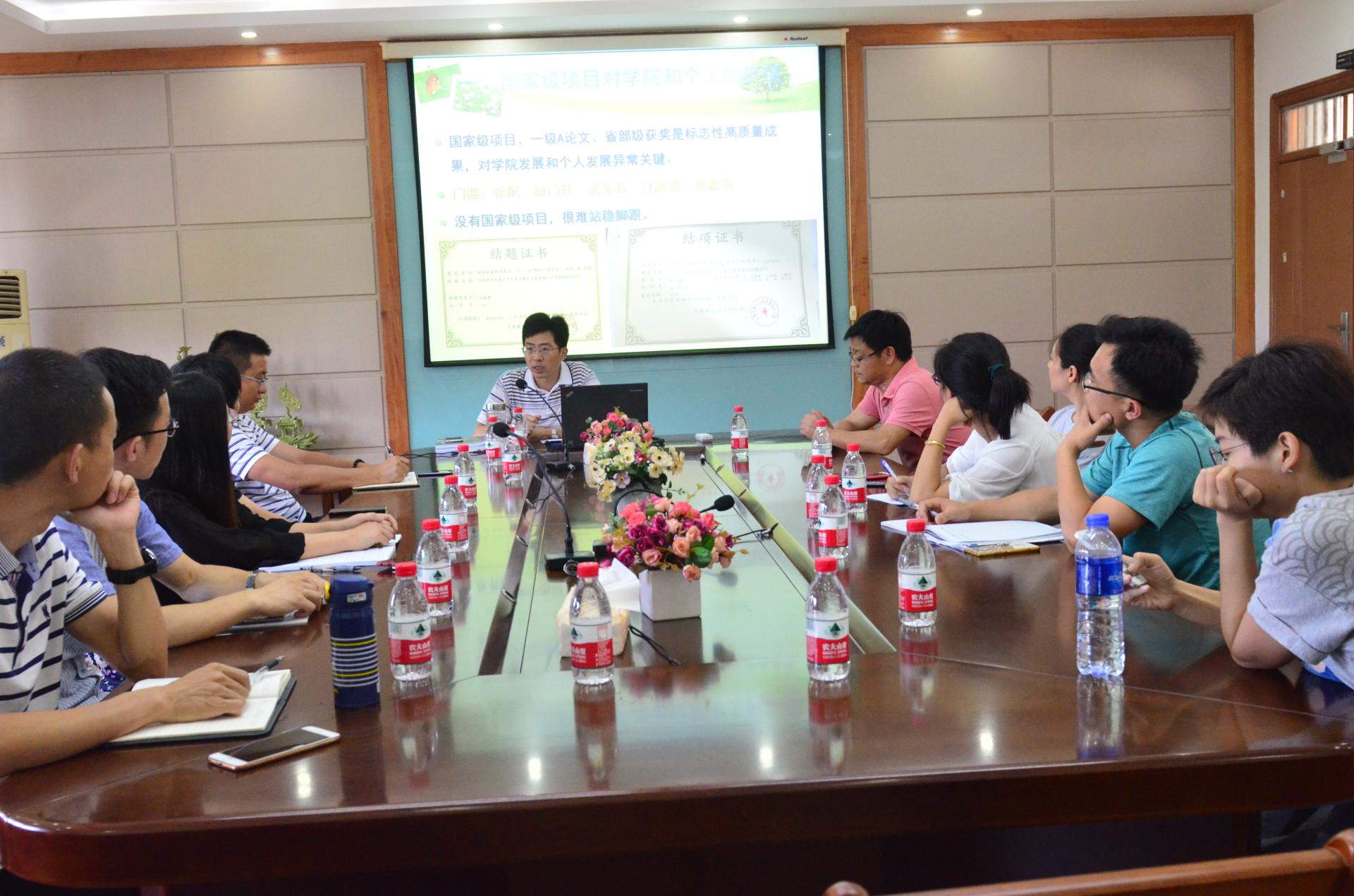 会上,王老师首先从七个方面对2019年国家级科研项目的申报进行了动员。即(1)国家级项目对学院和个人的价值;(2)放手做,勇敢错,年轻不怕失败;(3)机不可失 时不再来(遇见了就不要错过 错过了便不再来);(4)宜未雨绸缪勿临渴掘井;(5)吸收成功经验、汲取失败教训;(6)多参加会议,很有必要;(7)选题是项目立项关键。王老师鼓励学院教师(特别是青年老师)要大胆申报国家级课题,思路不成熟、时间紧迫都不是问题,并指出“须知课题是从大胆申报中获得的”。王老师特别强调课题申报书要反复修改锤炼,要首先感动自己,然后才能感天动地,并提出了课题修改锤炼需要实现G20(即修改20稿)的小目标。