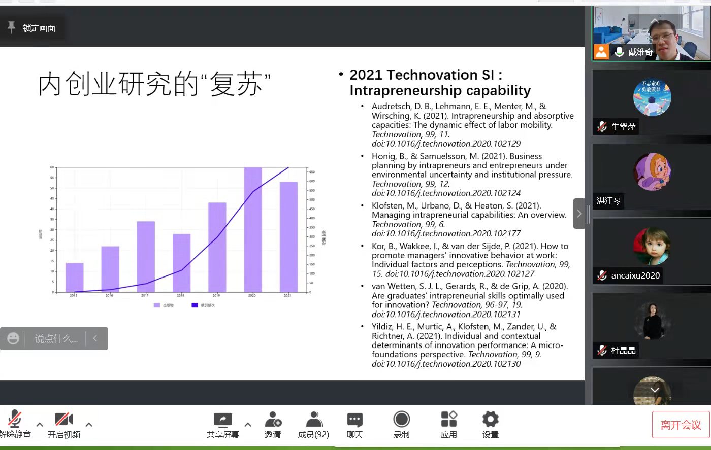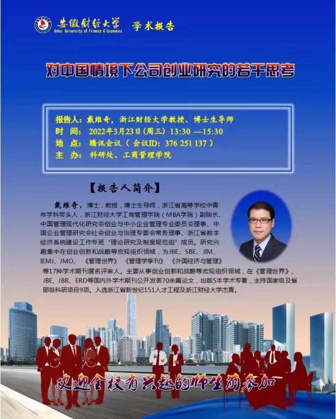 副院长戴维奇教授应邀为安徽财经大学师生做了一场题为《对中国情境下公司创业研究的若干思考》的线上学术报告。南开大学商学院张玉利教授对报告进行了专业点评。会议由安徽财经大学工商5278论坛