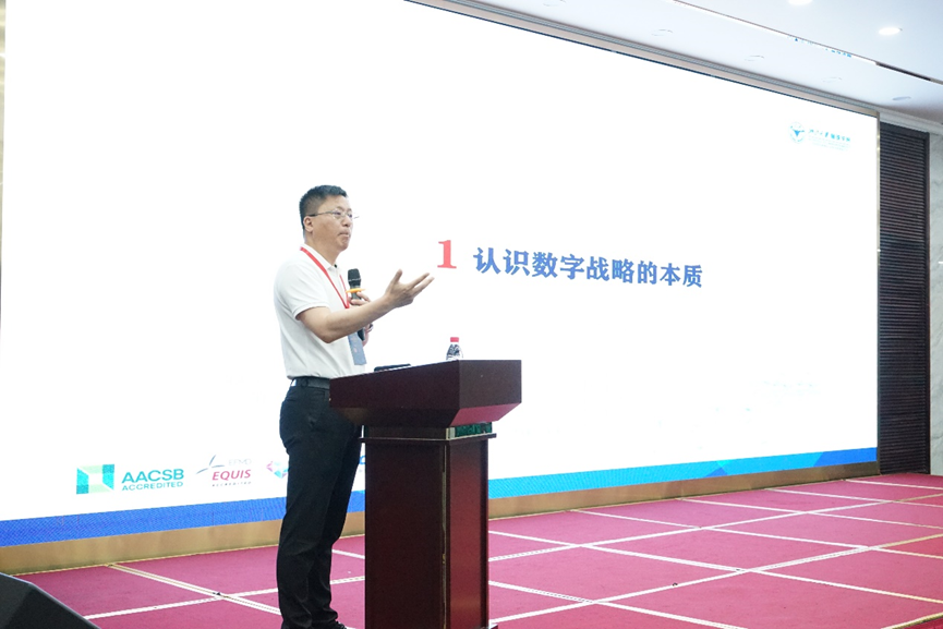 紧接着,王建明教授和戴维奇教授分别主持了四场主题报告。徐飞教授做了“创新创业与企业家精神”的主题演讲,他围绕“创新”“创业”“创新创业教育”这三个核心话题,强调创新创业教育对于个体、民族乃至国家的重大意义,点明创新创业永进不止。魏江教授带来了题为“数字创新与战略”的主题报告,他表示,企业战略的本质并未因数字时代的到来而改变,不过,随着数字技术的广泛应用,生产要素、产业组织形式、生产关系等发生了较大的变化,因而要求战略的形态进行改变。中国信息经济学会副秘书长兼数字经济创新联盟专业委员会主任、中山大学5278论坛
