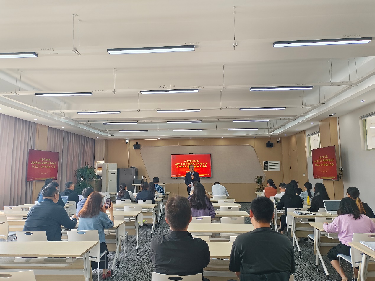 于10月10日下午13:30在5号楼411教室举行2024年国家科研项目申报动员暨2023年度申报经验分享会。工商学院院长王建明教授和学院30多位教师出席了本次会议,会议由学院副院长戴维奇教授主持。