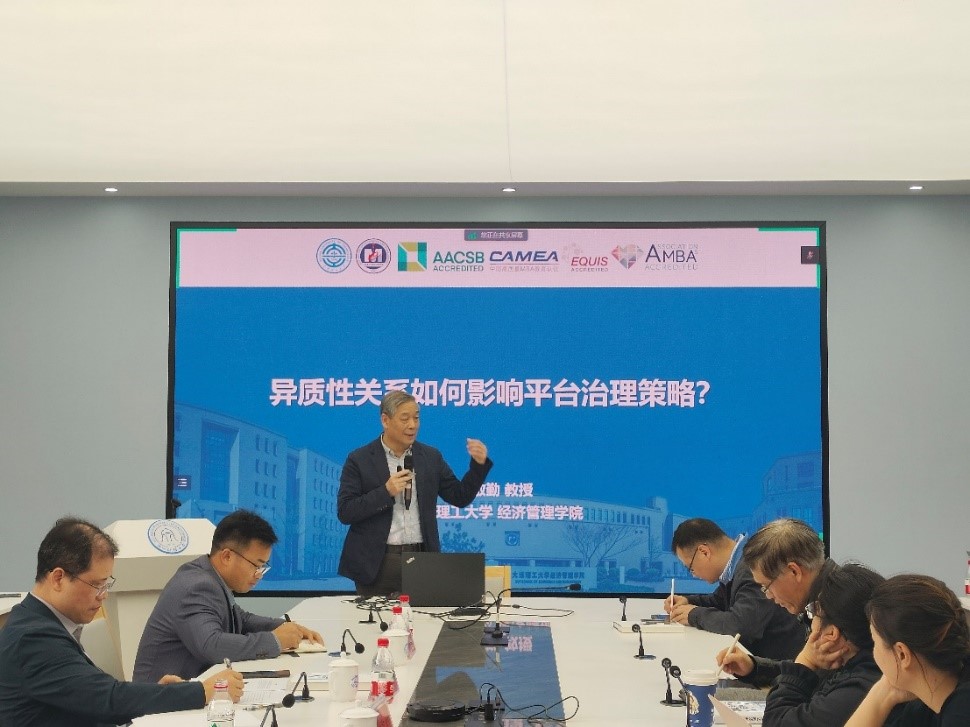 大连理工大学苏敬勤教授以“异质性关系如何影响平台治理策略”为题分享其研究成果。苏教授通过对比平台企业内外部治理的异同点引出关系治理在平台治理体系中的重要地位。随后引用行业典型案例,探讨抖音和快手两大平台的异质性关系,得出这两种不同关系类型的平台的治理规律。苏教授通过对比分析两平台的关系组成、行为模式、群体特征三方面的差异总结出同好关系和情感关系两种关系类型,并分析其在连接介质、连接形式、传播动力等方面的区别,探讨不同关系类型的平台企业的治理策略。苏教授指出,平台企业会依据自身关系类型,在“关系构建-关系维持-关系拓展”的框架下制定平台治理策略,以满足不同用户群体的关系需求,并提出异质性关系对平台治理策略的内在影响机制,即“强连接关系-弱治理的补偿机制”和“弱连接关系-强治理的管控机制”。