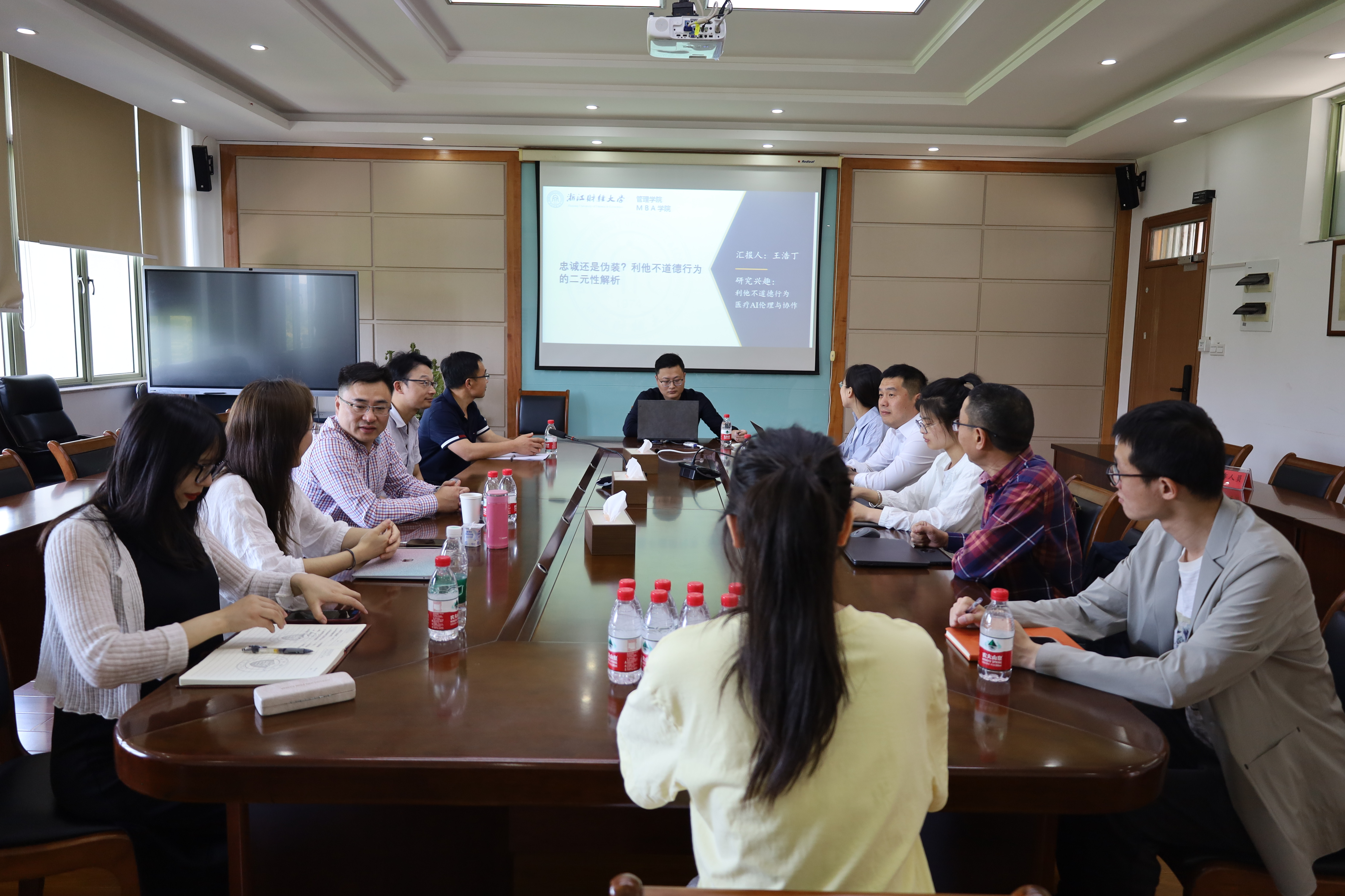 在学术交流环节,王雅婷老师探讨了UPB的研究现状与未来研究方向。随后,王建国老师立足于自己的研究方向,提出未来可以研究AI中的UPB,以扩展UPB的研究。针对未来的研究方向,陈帅老师也提出了自己的见解和看法,认为可以从亲家庭不道德行为角度进行思考和延伸,更深入地探讨亲组织不道德行为。另外,闫强老师等就样本的来源、收集数据的过程以及研究方法等进行了热烈讨论。