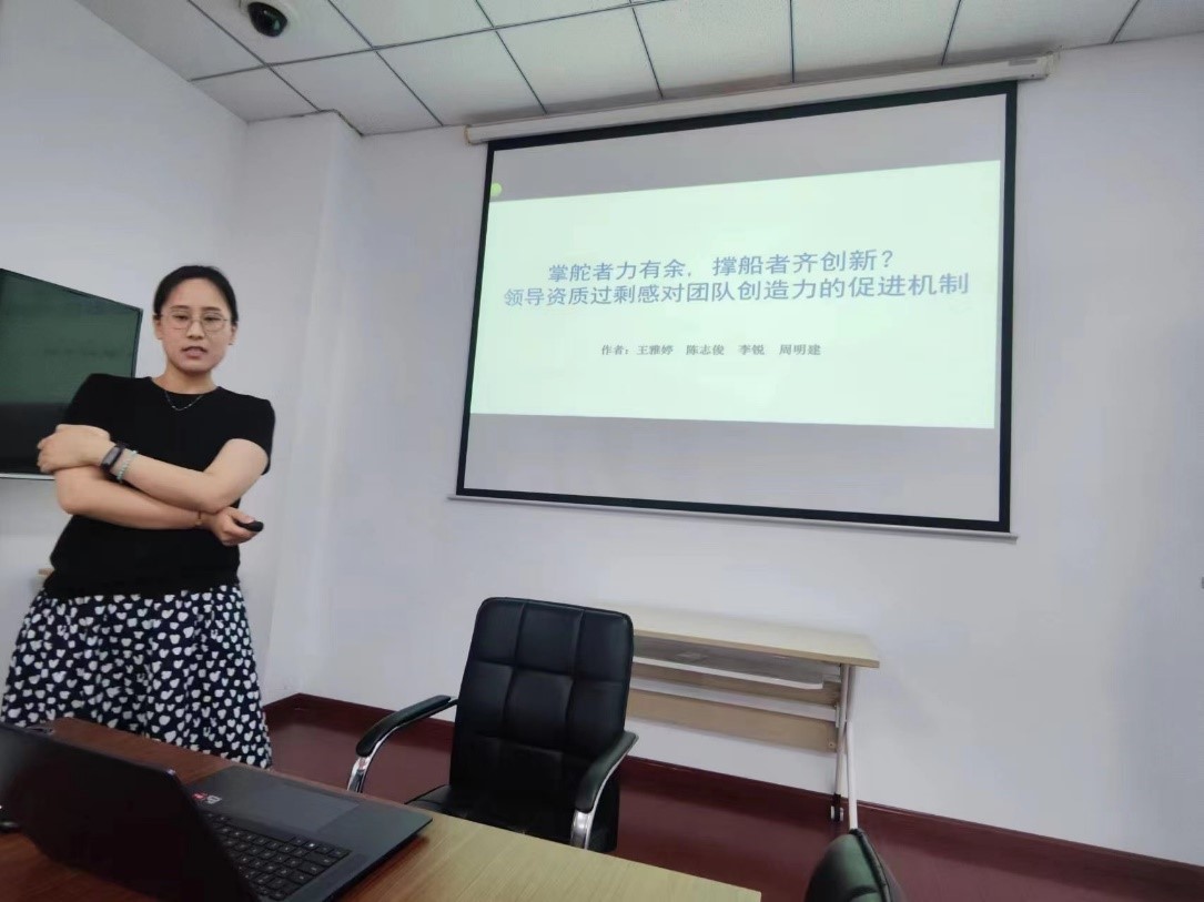 王雅婷老师从研究背景、假设发展、研究结果和讨论四个方面进行了汇报。首先,从实践背景和理论背景出发,阐述了研究领导资质过剩现象的必要性,并重点围绕当前的研究空白提出本研究的研究问题,即“资质过剩的领导何时以及如何通过自我调节来促进团队创造力”。其次,重点阐述了该研究是如何基于自我调节理论和基于团队过程的团队创新整合理论来提出假设的。再次,为了检验理论模型,阐述了研究样本、研究程序、研究工具、数据分析方法和数据分析结果。最后,在研究结果基础上,讨论了理论贡献、实践意义、研究不足以及未来的发展方向。