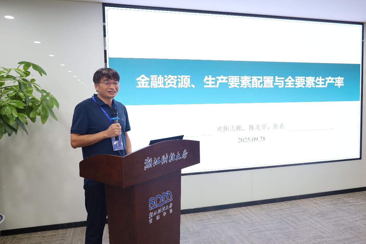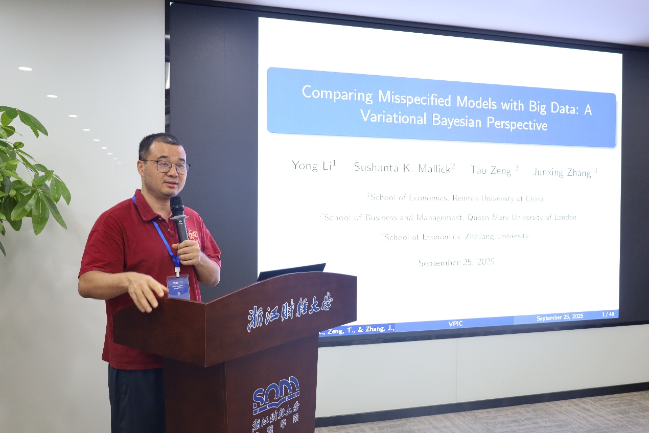宣传部部长王正新教授主持,华东交通大学副校长欧阳志刚教授、中国人民大学李勇教授作报告。欧阳志刚教授分享了主题为“金融资源、生产要素配置与全要素生产率”的学术报告。生产要素创新性配置是发展新质生产力、推动经济高质量发展的一个重要渠道,研究构建了一个包括融资部门金融资源配置和生产部门生产要素配置的理论分析框架,并基于中国企业中间投入占比较高的现状,在考虑实物资本和劳动两种生产要素的基础上进一步引入了中间投入,系统地测算并分析了不同类型的金融资源配置对各种生产要素配置及全要素生产率的影响。李勇教授分享了“基于大数据的贝叶斯统计推断研究进展及其应用”。研究针对海量数据下模型设定偏差的模型比较问题,提出两种新的基于惩罚的预测信息准则:先借助变分贝叶斯后验分布,从预测视角推导出变分插入预测分布和变分后验预测分布两类预测分布,接着研究了与这两类分布相关、以数据生成过程和预测分布间KL散度期望定义的风险函数,在特定正则条件下证明所提信息准则是各自风险函数的渐近无偏估计量,最后验证了其在海量数据模型设定偏差场景下模型比较的性能。