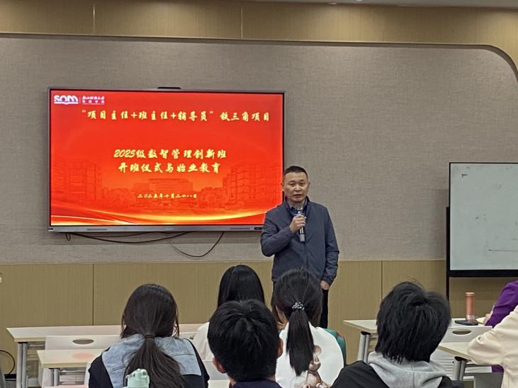 副院长、数智管理项目负责人张雷,学院党委副书记陈小芳,25级数智管理创新班项目执行人沈渊、班主任耿槟,学科竞赛负责人林与川,25级数智管理创新班班导鲍钰捷、25级数智管理创新班全体学生共同参与活动,本次活动由沈渊教授主持。