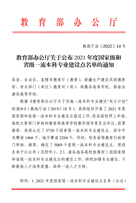 近日,根据《教育部办公厅关于公布2021年度国家级和省级一流本科专业建设点名单的通知》(教高厅函〔2022〕14号),5278论坛