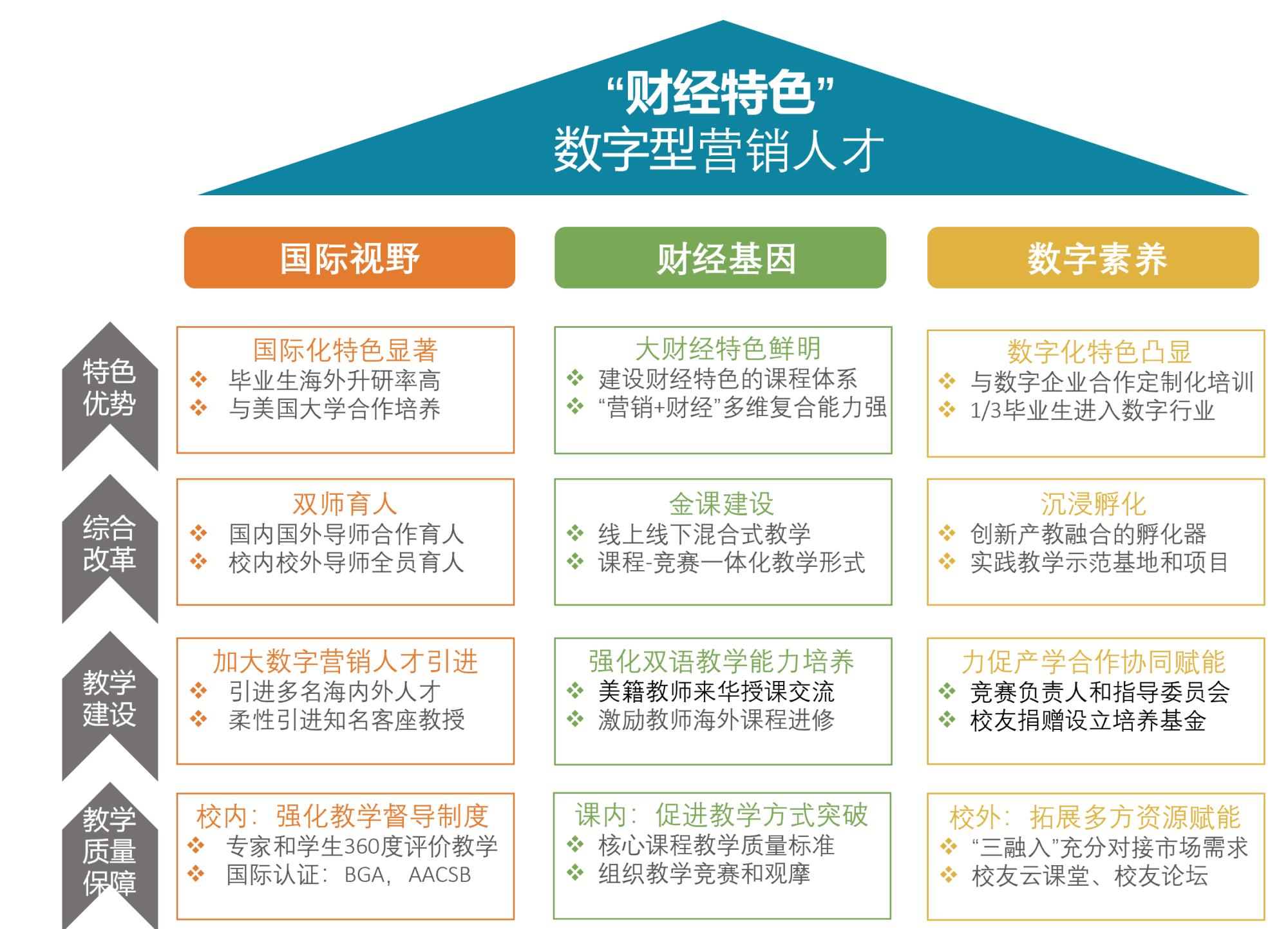 市场营销专业创建于1994年,依托工商管理国家一流学科,一级学科硕士学位点、MBA学位点,专业排名全国位列前4.08%,于2020年入选国家一流本科专业建设点。专业建有省级实验示范中心4个,省财政支持实验室1个,教育部产学合作协同育人项目7个,校外实践基地44个。有国家社科基金重大项目首席专家1人,省级人才工程2人,师德先进个人2人,中国高校市场学研究会常务理事2人、理事10人。基于强势学科平台、实践平台和师资队伍,形成了“国际化+大财经+数字化”人才培养优势。面向“互联网+”和国际化浪潮,对接浙江经济社会发展“数字经济、智能制造、互联网金融”等高端产业需求,培养具有国际视野和财经特色的数字型营销人才。