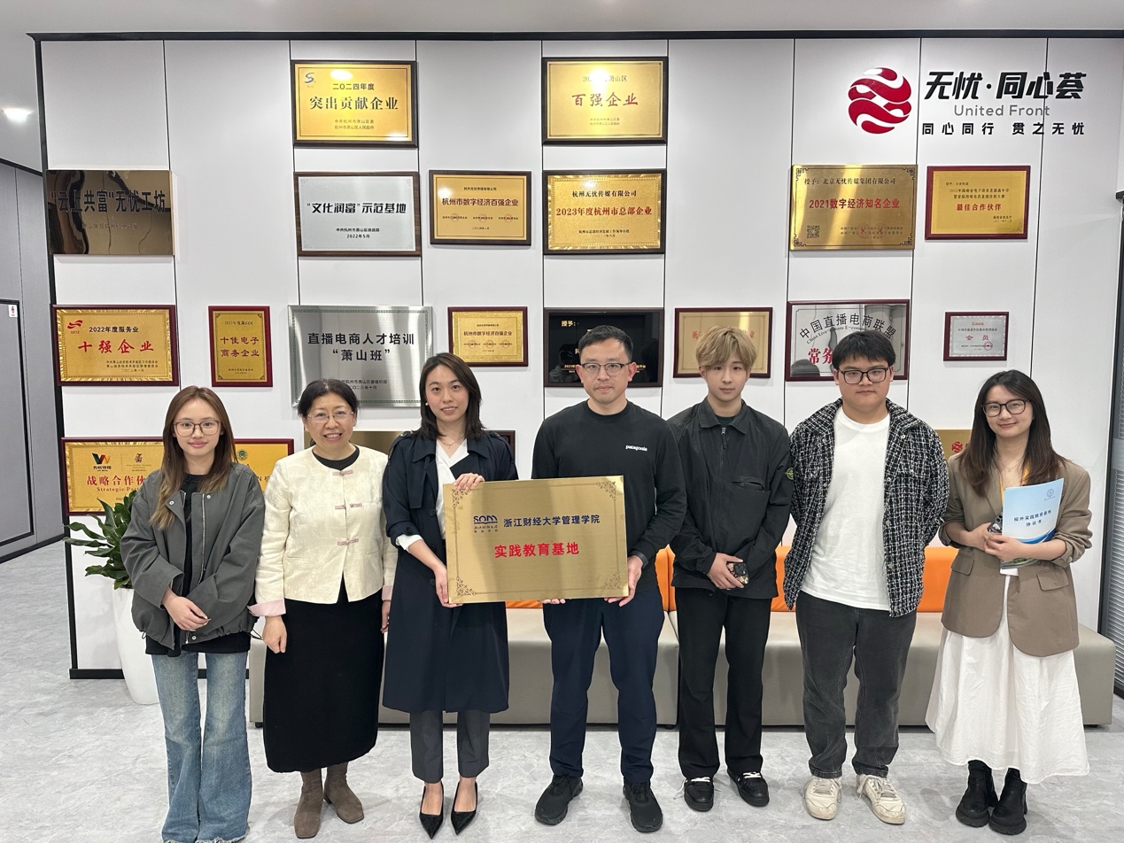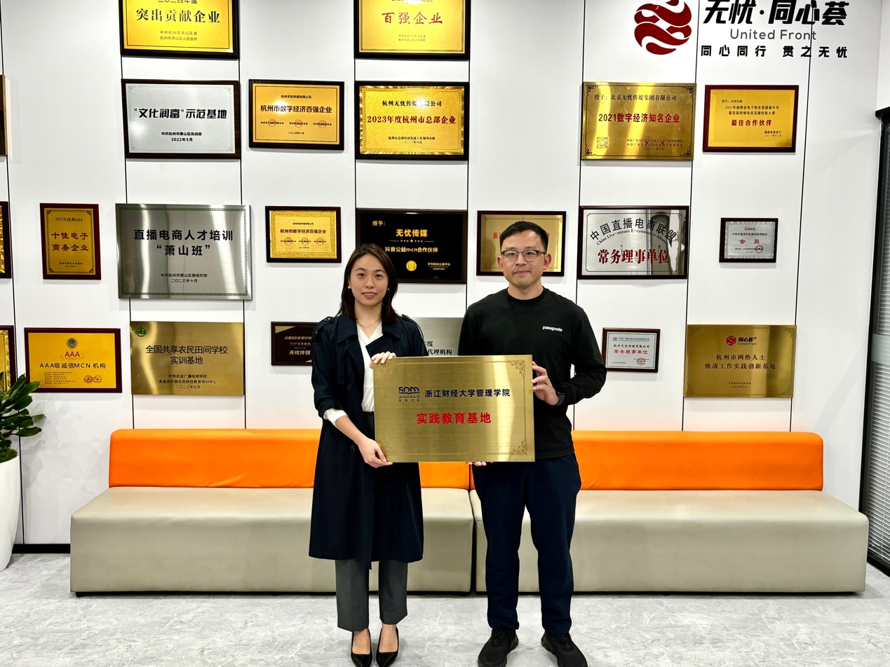 与杭州无忧传媒在公司总部举行了"数字营销实践教学基地"签约及授牌仪式。无忧传媒人才与文化发展总监郝凯及其工作人员,与学院市场营销系李晓锦、黎静仪两位老师等进行了签约授牌仪式。