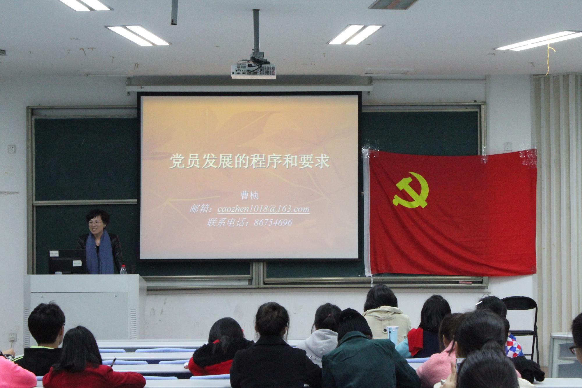 曹桢老师以同学们平时生活学习为切入点,提出党员所必需的写作能力、沟通能力和策划能力等三项能力,继而阐述了党组织发展党员必需高标准、高质量、严要求的理论原因。老师激情澎湃的讲话激起了同学们向党靠拢的热情,还让同学们积极参与讨论,发表自己感想。接下来,曹老师向各位学生讲述了党员发展的五个步骤,并向同学们详细剖析了入党申请书和上报材料的格式和内容。老师深入浅出的解析使同学们初识了党组织对入党积极分子的培养、教育和考察,感受到党组织对入党积极分子的关怀和重视。