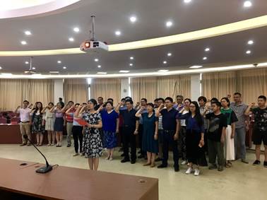 最后,学院举行了庄严的重温入党誓词仪式,全体教工党员在党委副书记、纪委书记谢敏带领下,面对党旗,再次重温誓言,进一步坚定了理想信念。