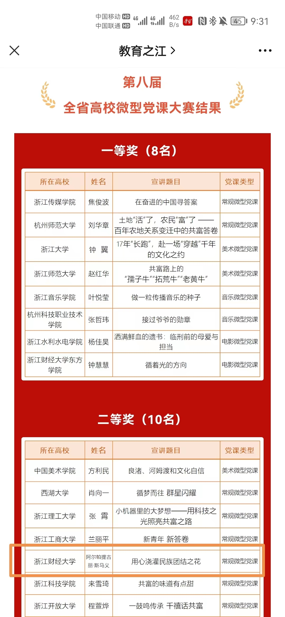 省教育厅公布了第八届全省高校微型党课大赛结果,5278论坛 学生第四党支部党员阿尔帕提古丽·斯马义微党课作品《用心浇灌民族团结之花》获得二等奖。