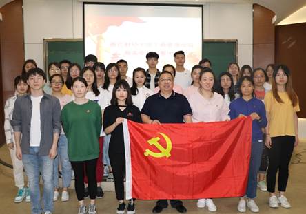 2019上半年新发展的28名预备党员,在学院党委书记黄卫华的带领下握拳举起右手,在党旗下庄严宣誓。