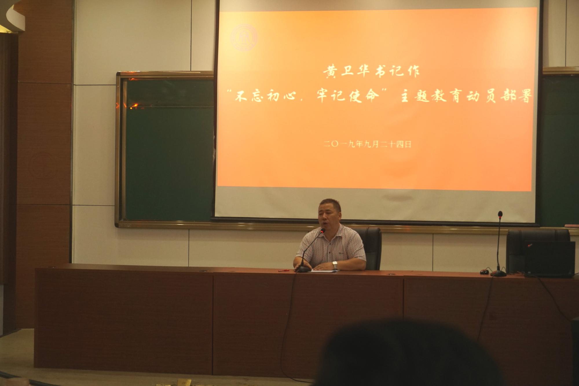 首先,黄卫华书记作“不忘初心,牢记使命”主题教育动员,并解读学院“不忘初心,牢记使命”主题教育实施方案。他指出,全院教师党员、教职员工要以彻底的自我革命精神解决违背初心和使命的各种问题,坚持抓思想认识到位、抓检视问题到位、抓整改落实到位、抓组织领导到位,努力实现理论学习有新进步、思想政治有新加强、干事担当有新作为、师生为本有新提升、转变作风有新形象六个目标,着重把学习教育、调查研究、检视问题、整改落实贯穿全过程,提高运用党的创新理论指导实践、推动工作的能力。随后,黄卫华书记根据学院“不忘初心,牢记使命”主题教育实施方案对接下来的具体工作作进一步的部署。