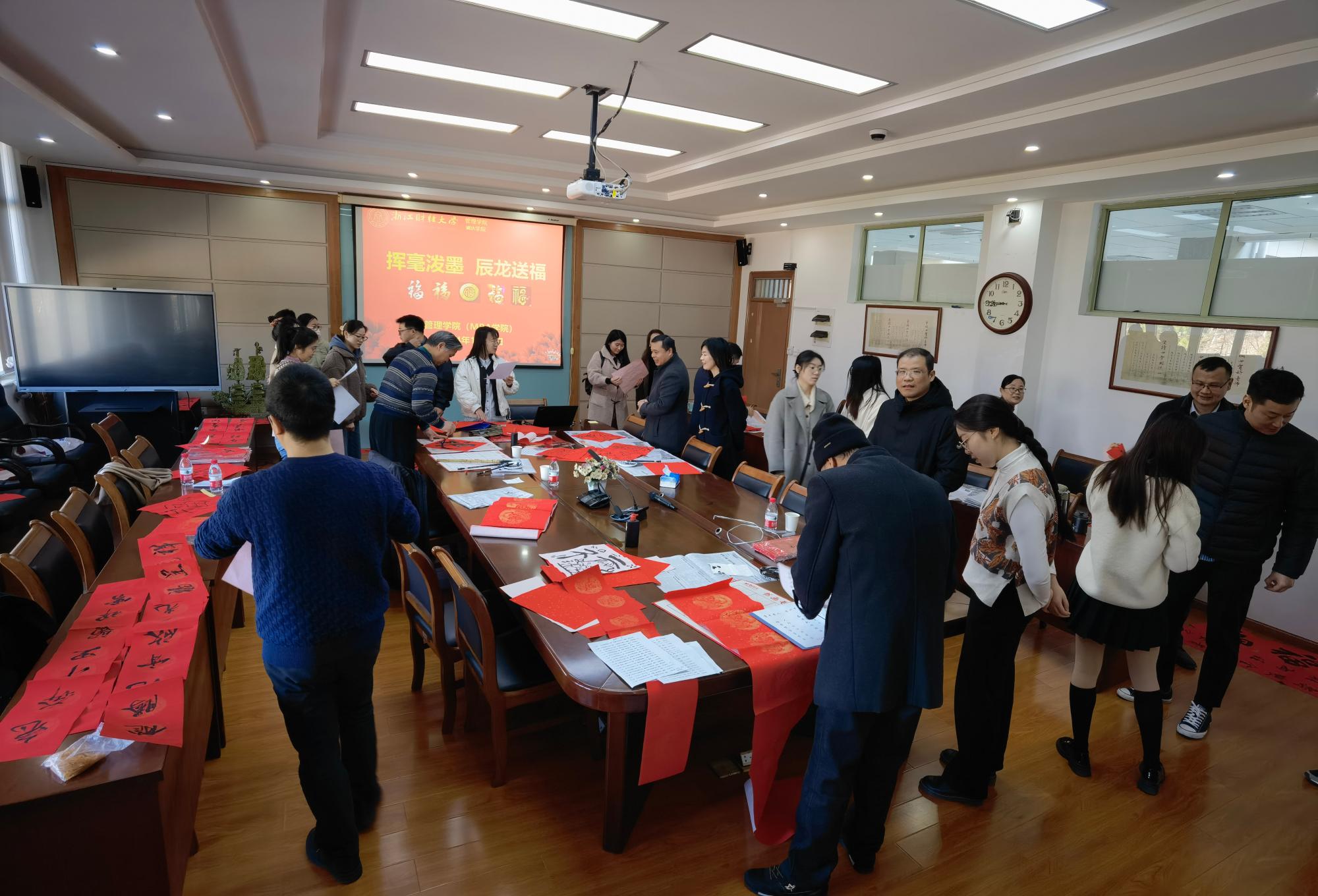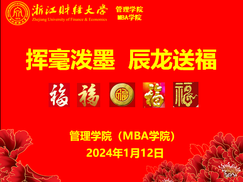 (MBA学院)工会主办的“挥毫泼墨 辰龙送福”写副春联带回家活动在学院楼410室举行。活动开始时,学院朱力明书记等领导班子代表学院给全体师生送上福字,也给大家送去龙年新春的美好祝福。守正创新共谋发展,形优速稳创建一流。