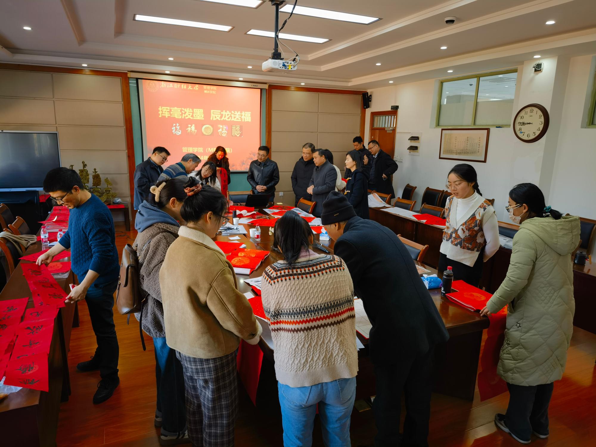 此次活动还邀请了浙江省书法协会的书法家王水泓老师、何建中老师与学院爱好书法的老师们一起挥毫献艺,书写龙年春联,也为大家写下对龙年新春的美好期盼。活动现场,热闹非凡,喜气洋洋,墨香四溢,暖意融融。大家通过各种方式邀请书法家们为自己写上一幅满意的春联,希望自己在新的一年里有新的气象。一副副喜庆吉祥的春联、一句句美好的龙年祝福跃然纸上,充满着浓厚的喜庆氛围。此次活动累计送出春联100余副,“福”字120余个。一幅幅春联,一张张福字,一句句祝福,既有挥别兔年、喜迎龙年辞旧迎新的美好愿景,也有平安吉祥、和谐发展的励志高歌。活动一直持续到下午4点钟才结束。