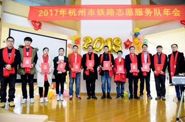 2017年度志愿服务先进集体奖,杭州铁路站团委书记周嫣然、杭州志愿者协会副秘书长毛立靖为获奖者颁奖。