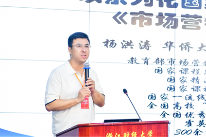 华侨大学杨洪涛教授做了“以系列化国家一流课程建设为引领的《市场营销》教学实践分享”的主题演讲,指出市场营销教学应结合互联网和即时通讯发展的时代背景,采用虚拟教研室的新形式,进行线上线下混合式教学,提高学生学习兴趣。
