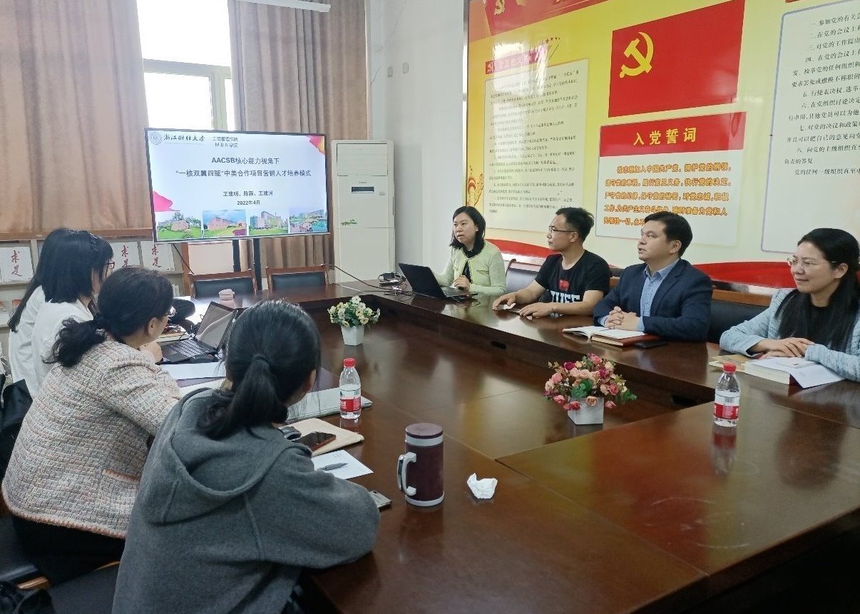王建国首先整体介绍了中美营销项目运行十年所取得的成果,梳理了项目特色与优势。陈颖结合中国高校市场学会教学年会提报的《AACSB核心能力视角下“一核双翼四驱”中美合作项目营销人才培养模式》全国三等奖作品,以及学校三全育人案例的撰写心得,分析了教学成果奖的材料整理情况。