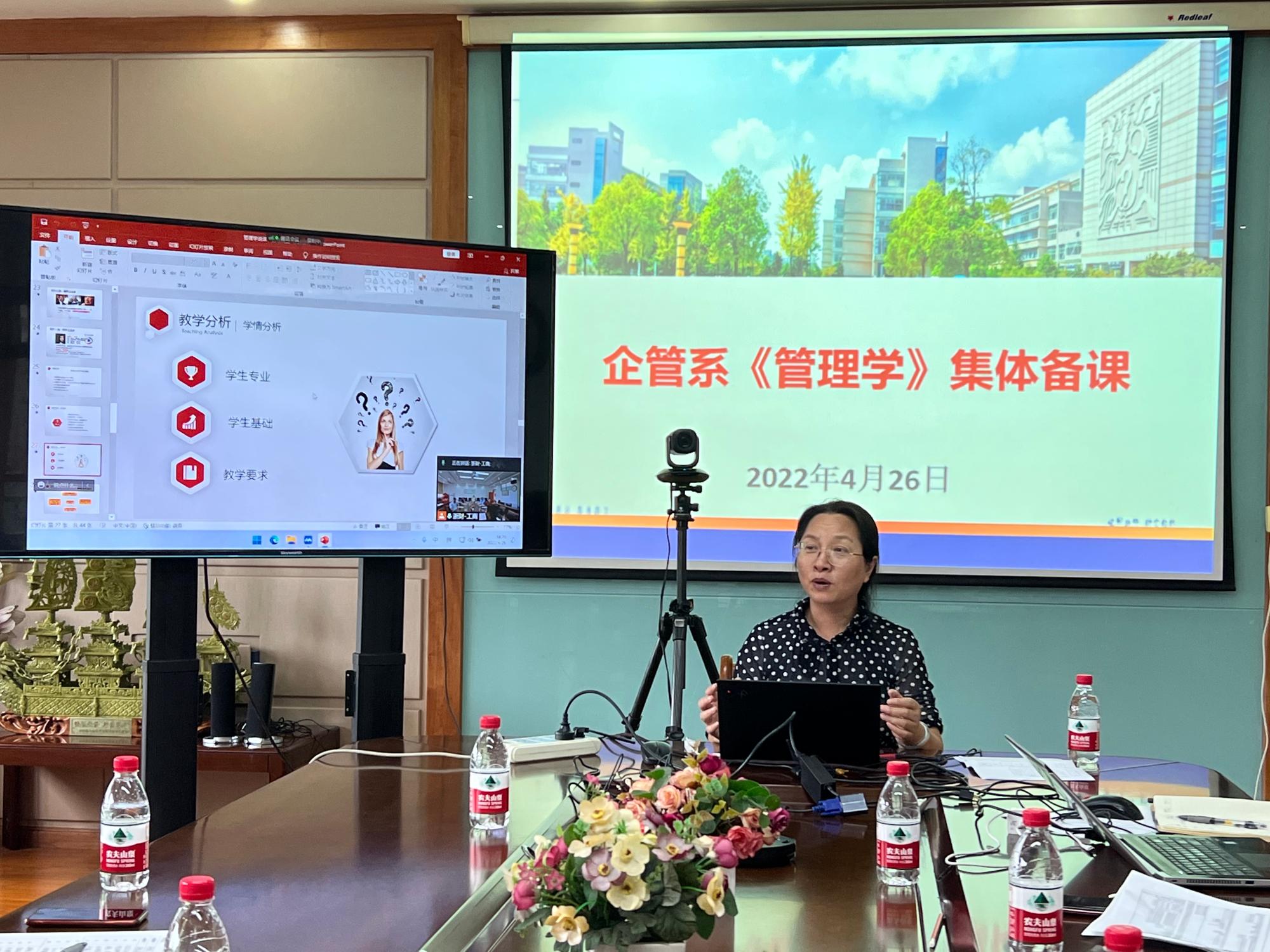 尤利群老师讲述了《管理学》课程的总体安排、课程设计、教学目标和教学内容,分享了教学经验,用说课的方法介绍了第一章管理导论的教学内容和方法;组织讨论了本学期《管理学》教学工作、说课任务的分配,讨论了下学期教学任务的落实和本学期期末考试的安排,并提出了组建课程核心建设团队的建议。