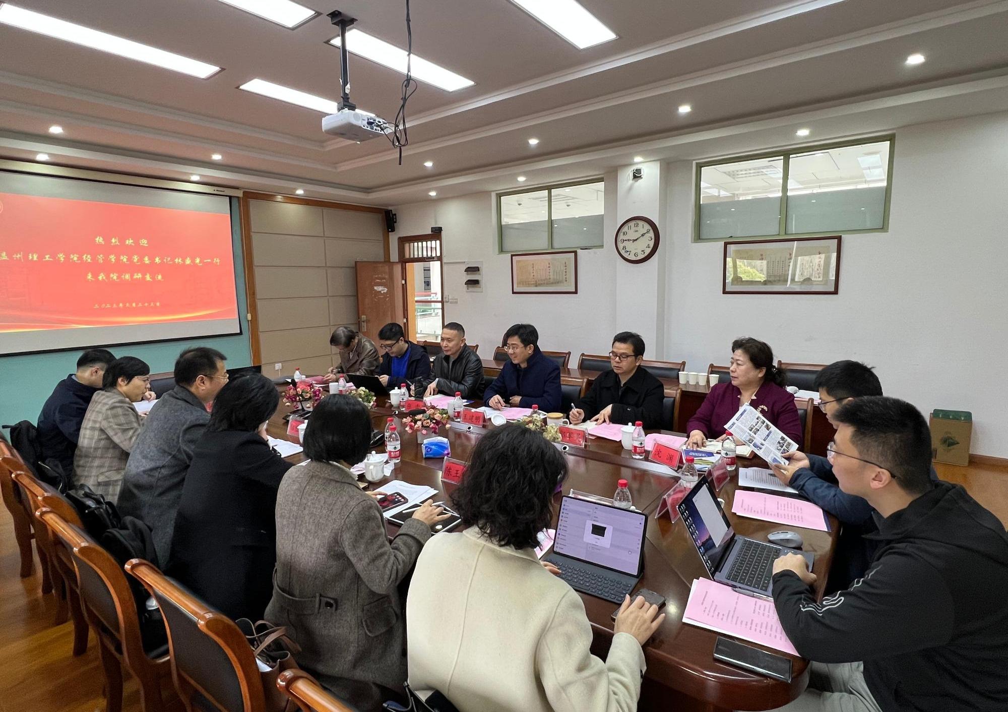 进行调研,学院院长王建明、教学副院长张雷、院党委成员郭军灵、企管系教工支部书记包兴、数智管理创新班执行人沈渊、EDP培训中心主任黄纯、企管系教师赵昶等人在学院410会议室进行了交流。