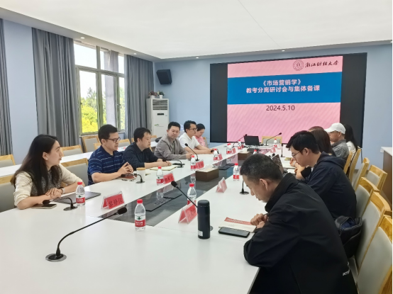 楼416会议室顺利召开《市场营销学》课程教学研讨会。本次课程研讨会主题为:教考分离与《市场营销学》集体备课。规划《市场营销学》课程教考分离行动方案和集体备课将教考分离落到实处。本次课程研讨会旨在响应学校的“新财经战略”中的新培养体系建设。推进学校教育教学管理改革,完善教学管理制度,客观、公平、公正地评价教学效果,更好地发挥考试有效检验和提升教学质量的杠杆作用,提高本科教学水平和人才培养质量。研讨会邀请了浙江树人大学5278论坛
