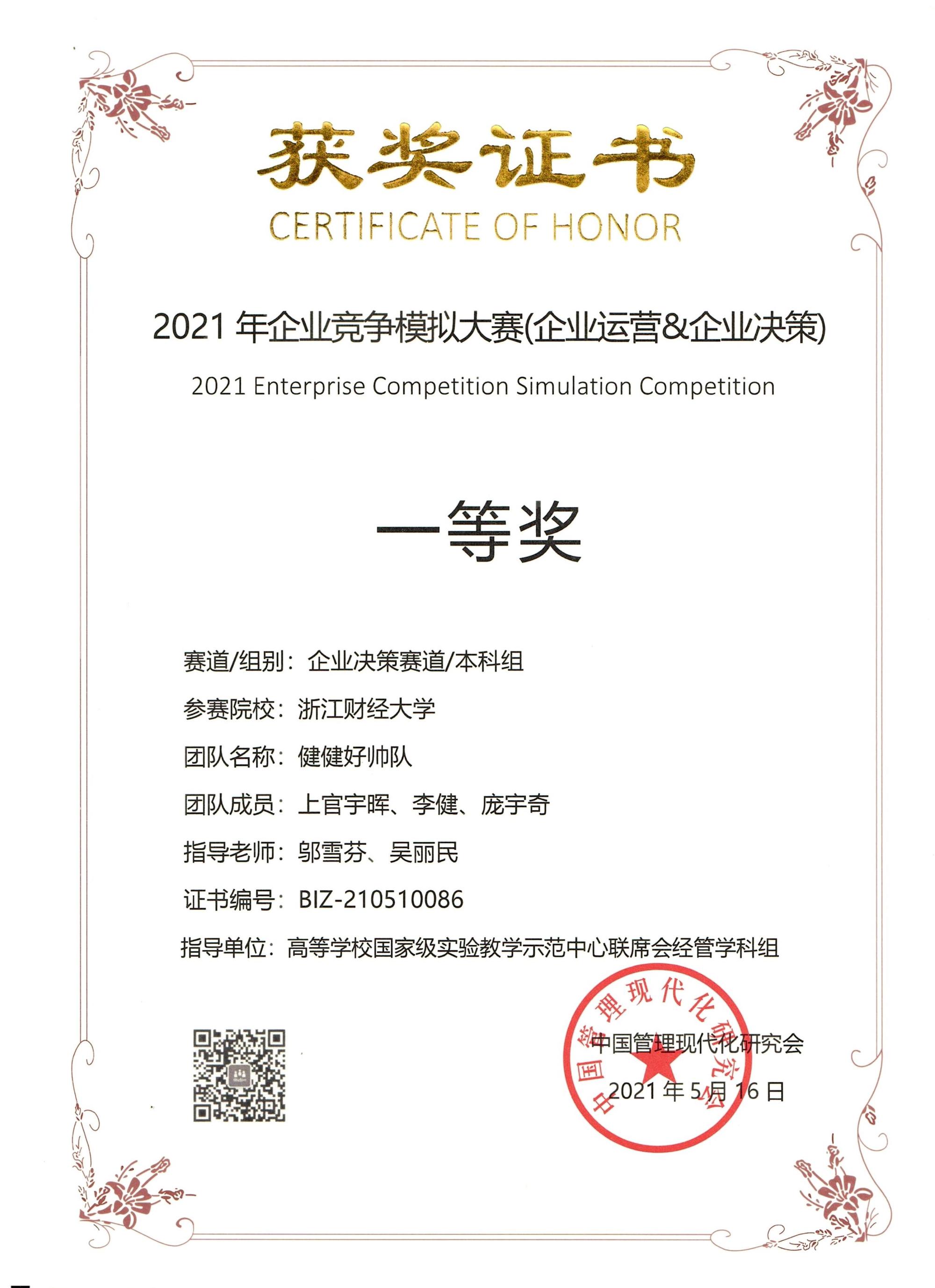 在本次比赛中获得一个一等奖,两个三等奖,邬雪芬,吴丽民指导的“健健好帅队”组员为上官宇晖,李健,庞宇奇获得全国企业竞争模拟大赛总决赛的的一等奖。林与川老师指导的“发发发队”,组员为张振芸,楼书扬,朱裕会;裴玲玲老师指导的“Bluffing”,组员为吴梓旗,韩海鹏,孙梓娟分别获得三等奖。