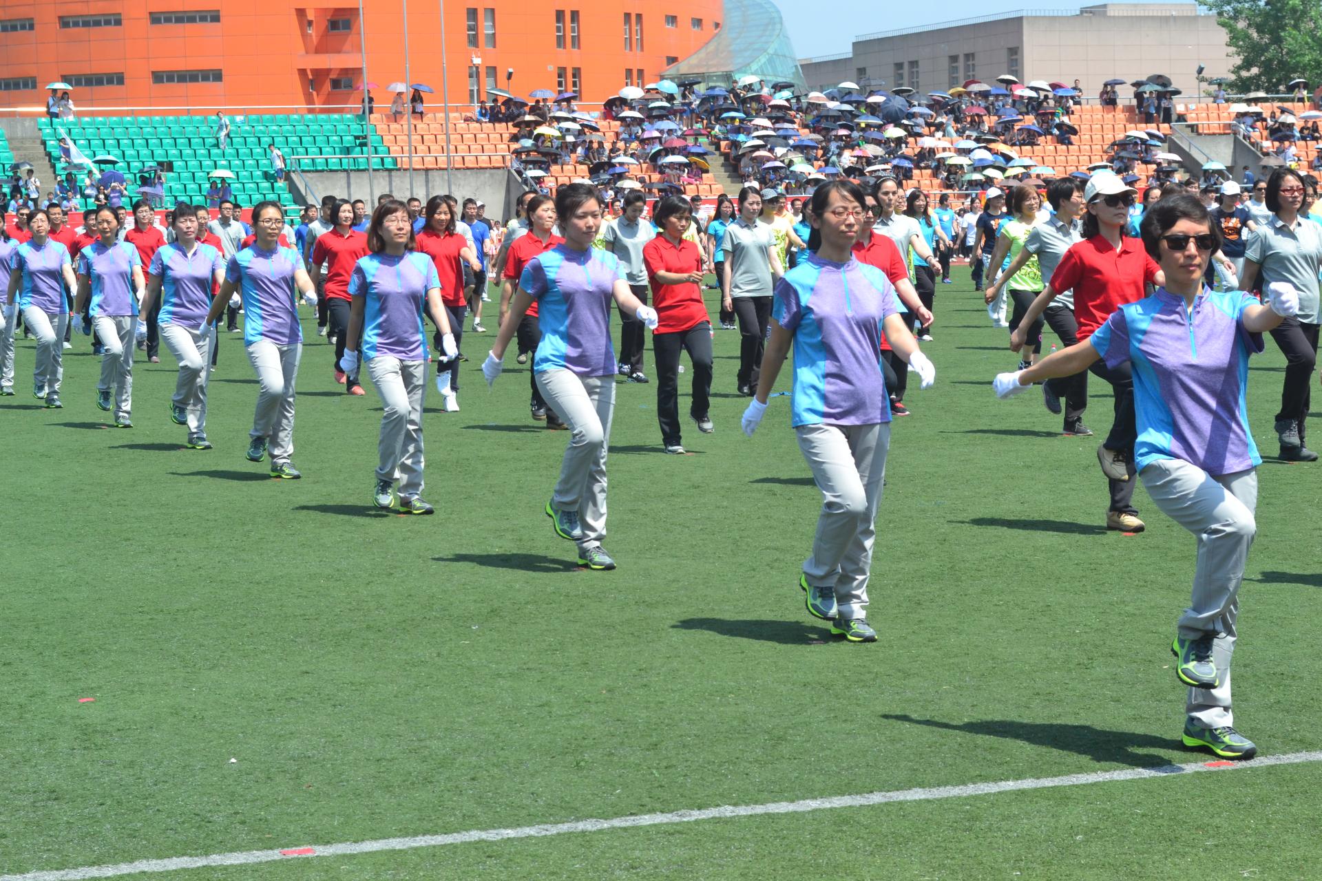 教职工组成的队伍在广播操比赛中神采飞扬,健美操代表队在健美操表演中青春动人。