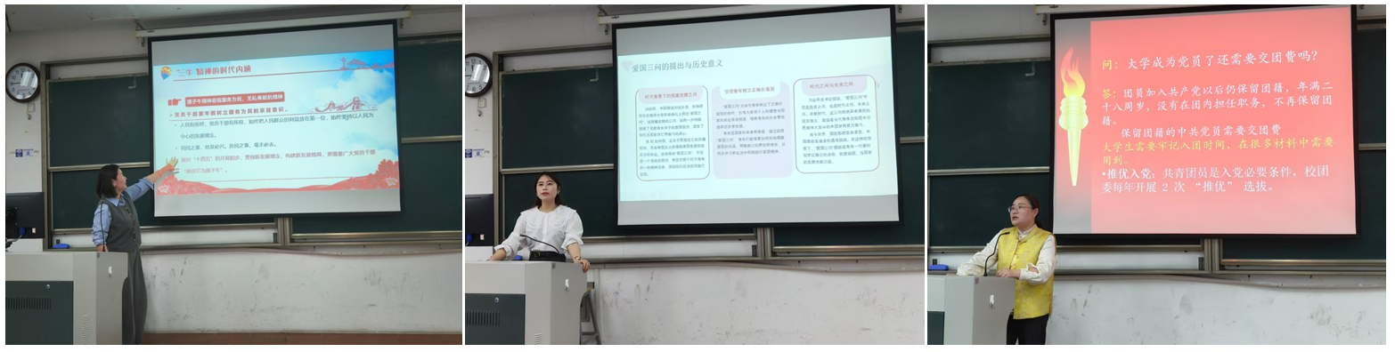 阿尔帕提古丽·斯马义老师通过深入讲解“三牛”精神的时代内涵,激励青年学生在全面建设社会主义现代化国家新征程上披荆斩棘、奋勇前进。陈蓓蓓老师以爱国三问为基,筑牢团员信仰之魂,鼓励青年学生在新时代展现新作为。梁磊老师则是对团的基本知识作出介绍,为我们深入了解团的相关情况打下基础。