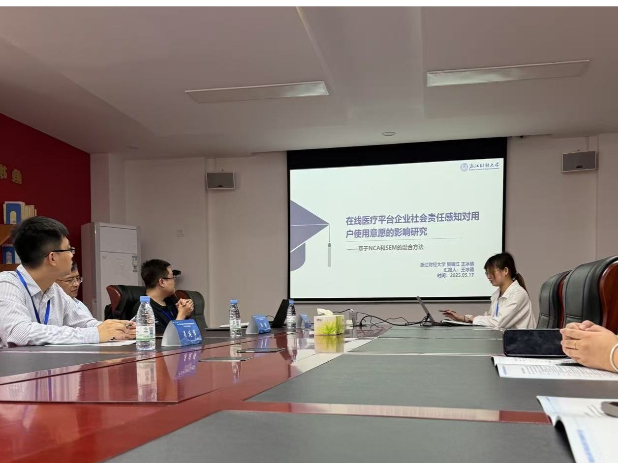 2023级硕士研究生王冰倩与导师贺锦江副教授合作的论文《在线医疗平台企业社会责任感知对用户使用意愿的影响研究——基于NCA和SEM的混合方法》受邀汇报。该论文探讨平台企业社会责任感知如何通过用户认知路径影响其行为,拓展了平台企业社会责任感知在高敏感信息服务场景下的作用边界,丰富了技术接受模型的中介路径识别,并为在线医疗平台通过强化社会责任履行以提升用户行为提供了现实启示。