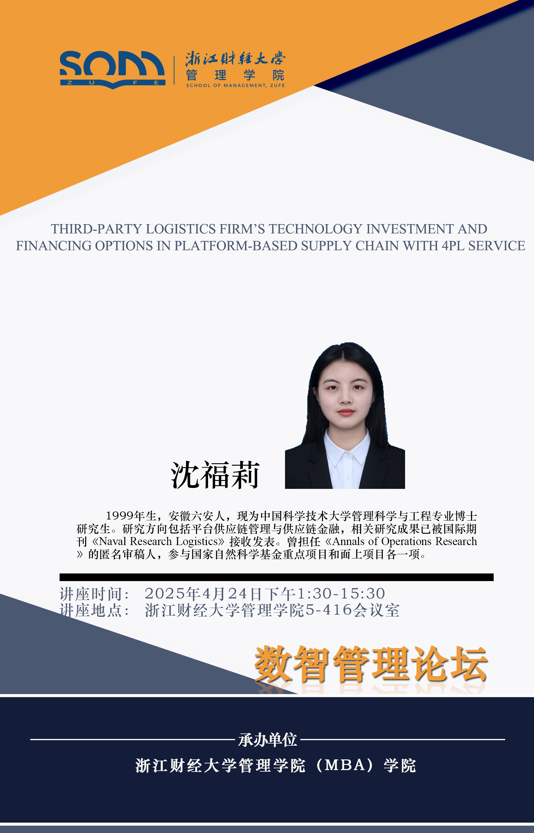 5278论坛 新财经战略系列学术活动2025年第17期【学术报告】沈福莉:Third-party logistics firm’s technology investment and financing options in platform-based supply chain with 4PL service (第三方物流企业技术投入和融资策略研究)
