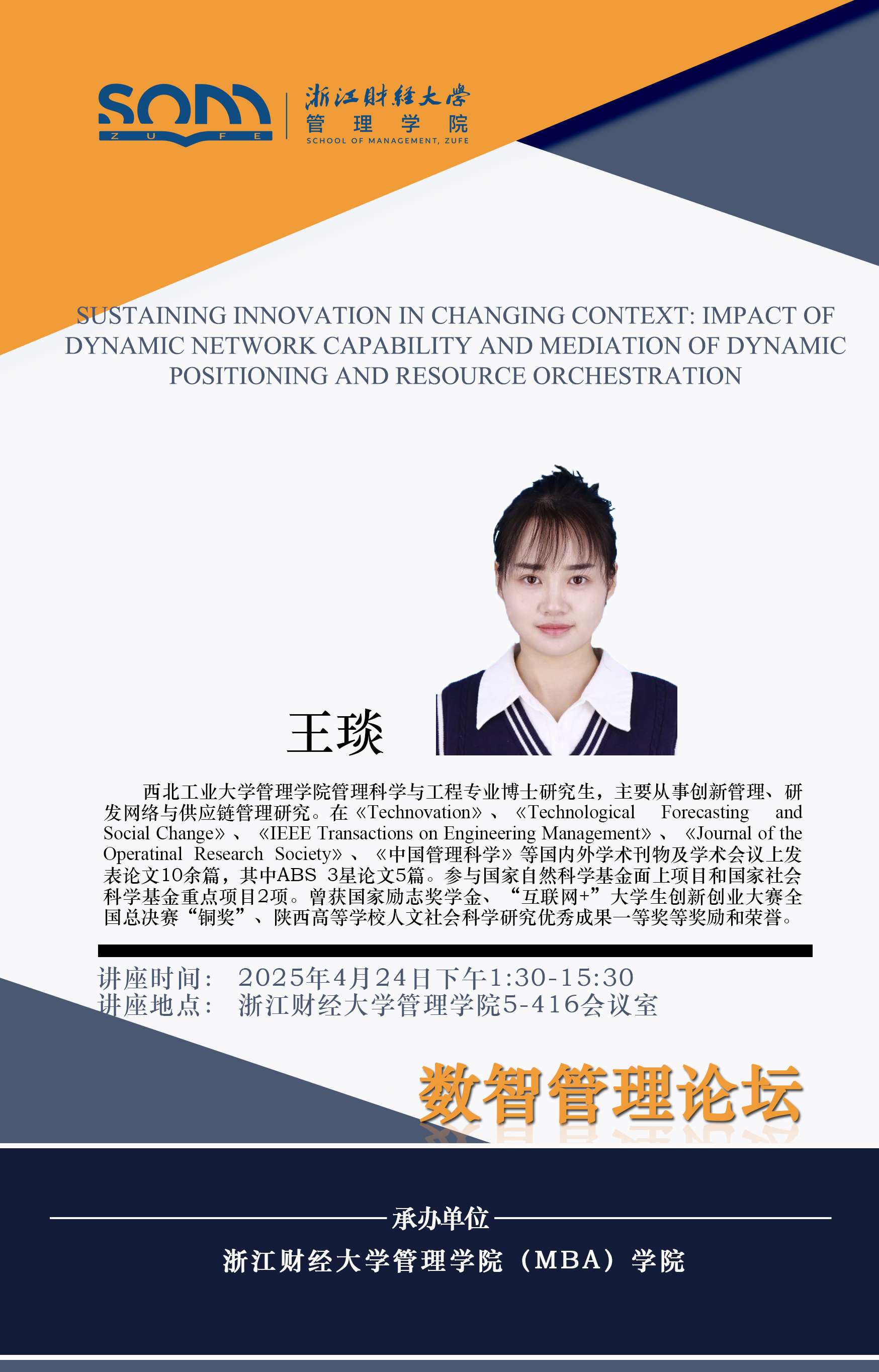 5278论坛 新财经战略系列学术活动2025年第19期【学术报告】王琰:Sustaining Innovation in Changing Context Impact of Dynamic Network Capability and Mediation of Dynamic Positioning and Resource Orchestration