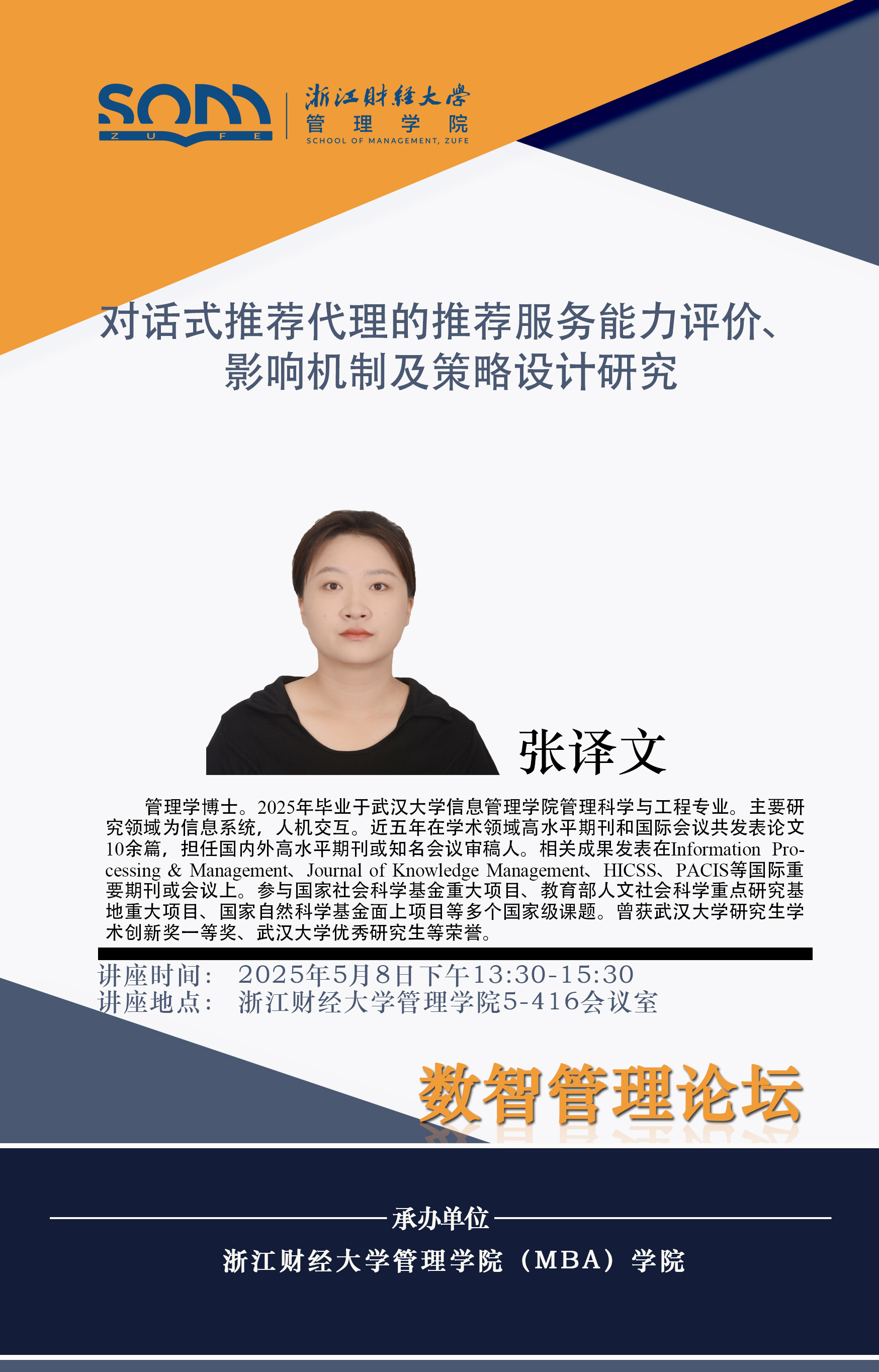 5278论坛 新财经战略系列学术活动2025年第32期【学术报告】张译文:对话式推荐代理的推荐服务能力评价、影响机制及策略设计研究