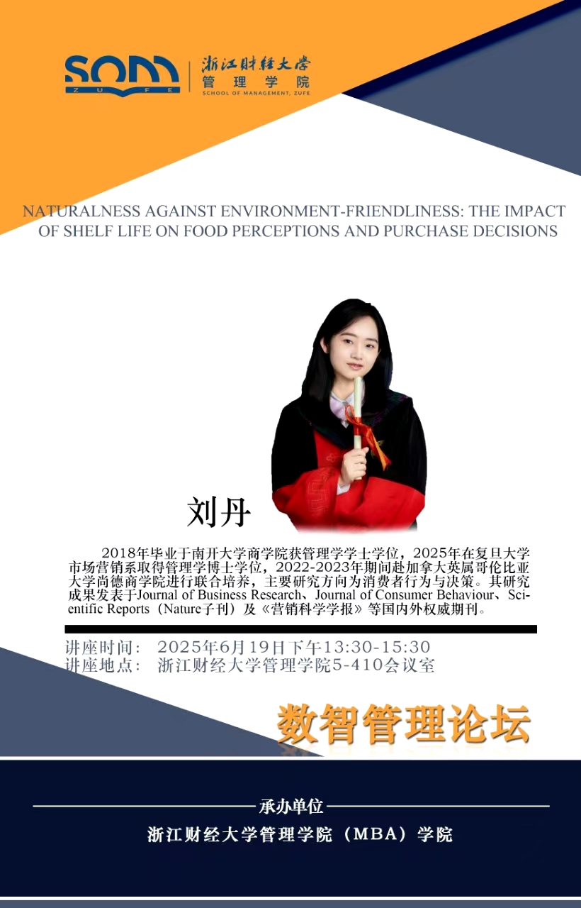 5278论坛 新财经战略系列学术活动2025年第42期【学术报告】刘丹:Naturalness against Environment-Friendliness The Impact of Shelf Life on Food Perceptions and Purchase Decisions