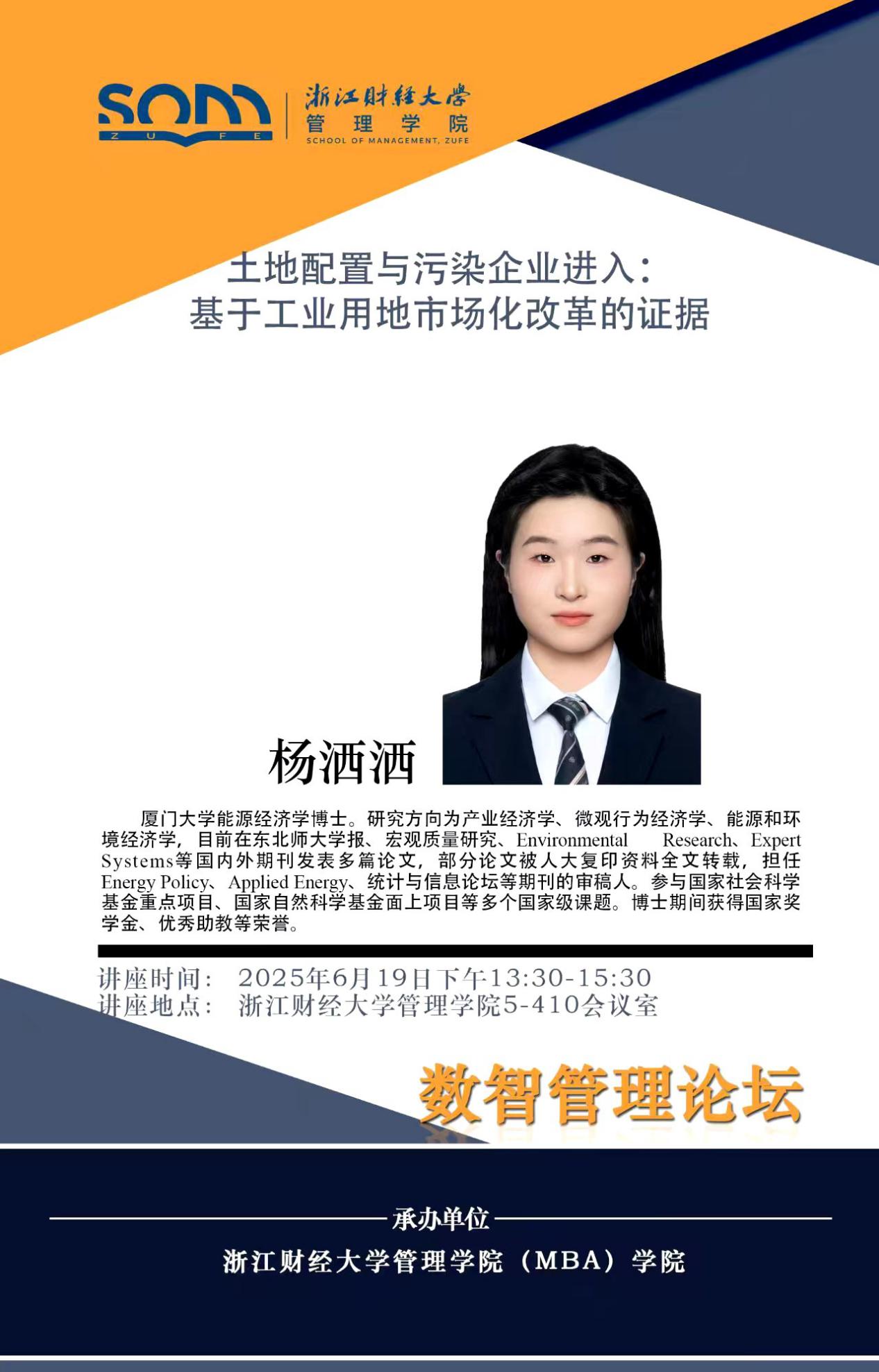 5278论坛 新财经战略系列学术活动2025年第46期【学术报告】杨洒洒:土地配置与污染企业进入:基于工业用地市场化改革的证据
