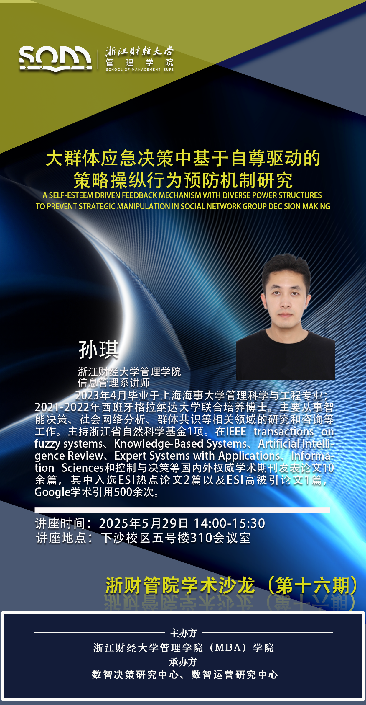 【浙财管院学术沙龙(第十六期)预告】孙琪:A self-esteem driven feedback mechanism with diverse power structures to prevent strategic manipulation in social network group decision making
