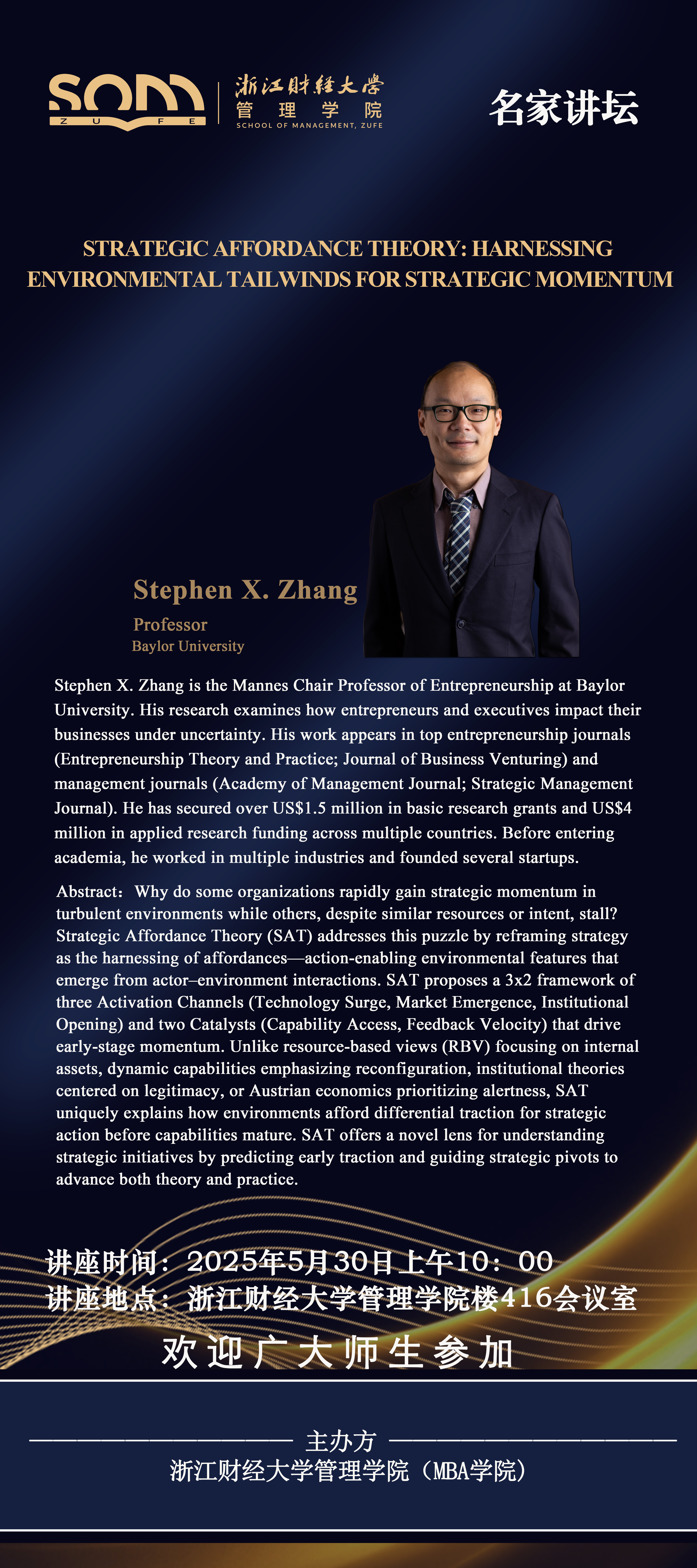 5278论坛 新财经战略系列学术活动2025年第41期【名家讲坛】Stephen X. Zhang:Strategic Affordance Theory :Harnessing Environmental Tailwinds for Strategic Momentum