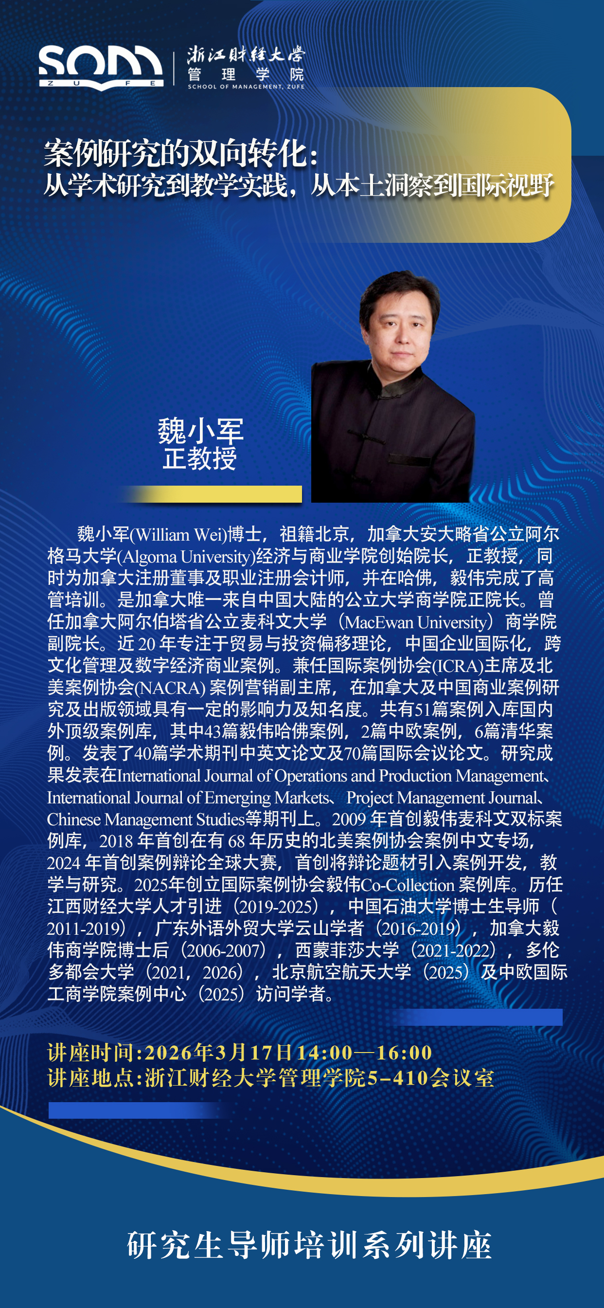 基于多年来在加拿大与中国高校的案例开发与教学实践及发表的51篇案例(43篇哈佛毅伟案例,2篇中欧案例,6篇清华案例),主讲人将分享与Ivey、哈佛等国际案例库的合作经验。本次讲座将围绕“案例研究的双向转化”展开,系统阐述:研究案例与教学案例的区别与联系;研究案例如何推动理论创新;教学案例如何助力学生决策与实践能力;两者之间的转化路径与协同机制;本土案例与国际案例的融合与转化;如何将中国企业的实践提炼为具有国际教学价值的案例;国际案例库对中国本土案例的接纳与转化策略;案例写作、评审与出版的关键环节;案例开发的新趋势与工具;快案、微案、简案,短案,粗案,活案,精案,多媒体案例等新型案例形式;案例写作资源与发表平台介绍(如Ivey、哈佛案例库等);案例教学法与课堂实施建议;实战经验分享。