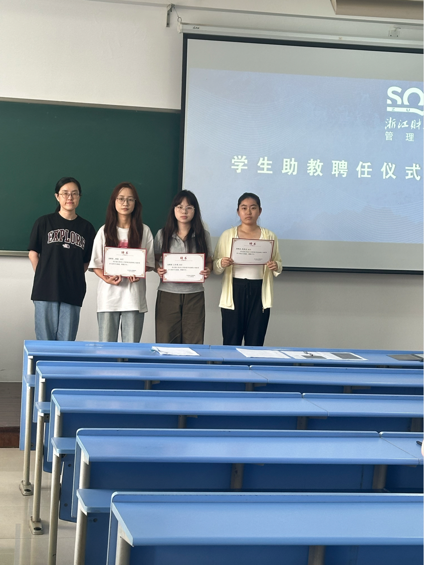 随后举行学生助教聘任仪式。沈晓云为承担此次补习班授课任务的四位优秀学生助教颁发聘书,并合影留念。沈晓云对助教们取得的优异学业成绩和展现出的良好综合素养给予了高度评价,她号召同学们以助教为标杆,秉持见贤思齐的态度,在学习中相互激励、携手共进,共同营造积极向上的学习氛围。